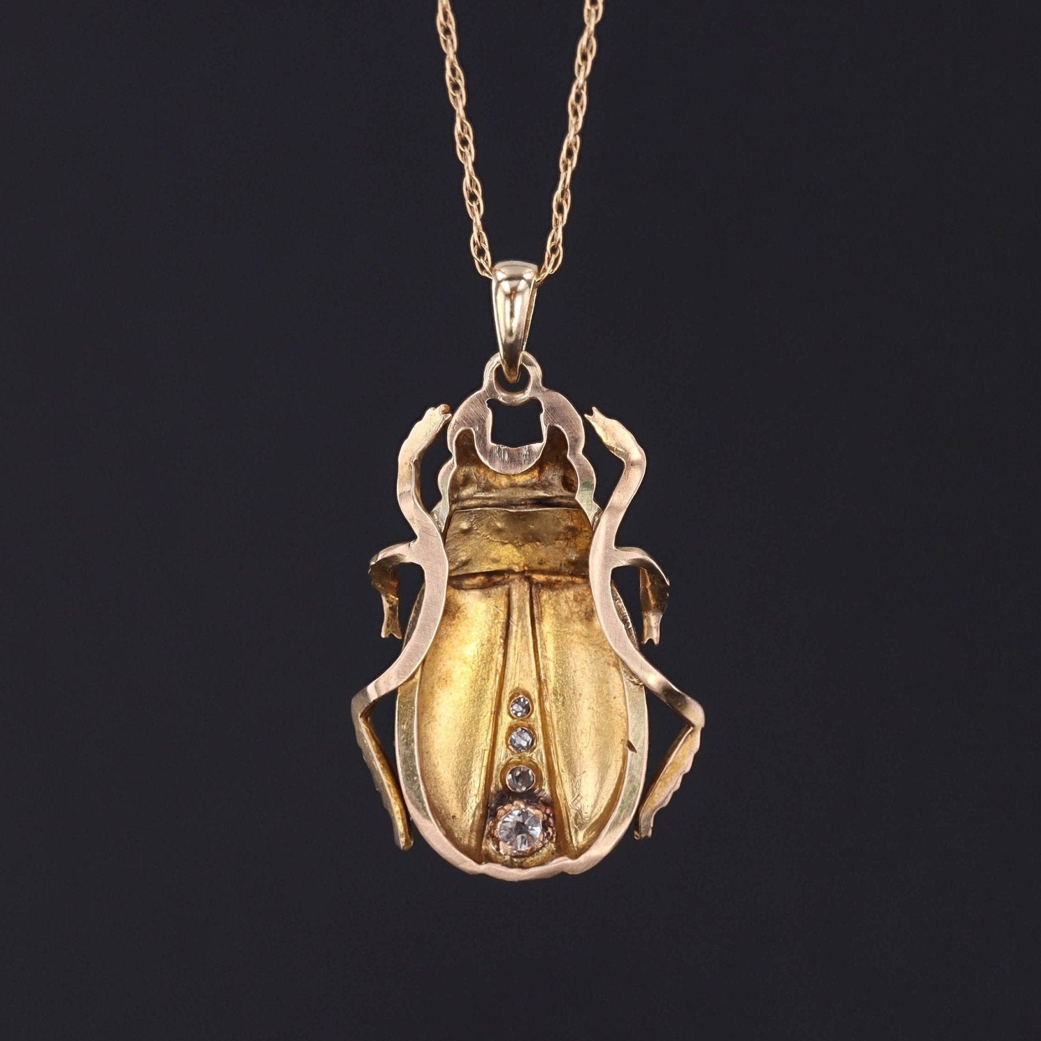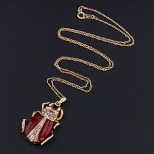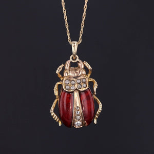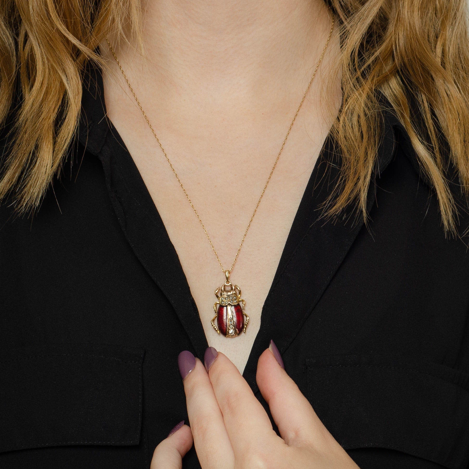 This beautifully rendered beetle pendant was originally an antique brooch (circa 1880-1900) that our jeweler transformed by removing the pin findings and adding a gold bail. The 10k gold pendant features a red enamel beetle with diamond and simulated half pearl accents.