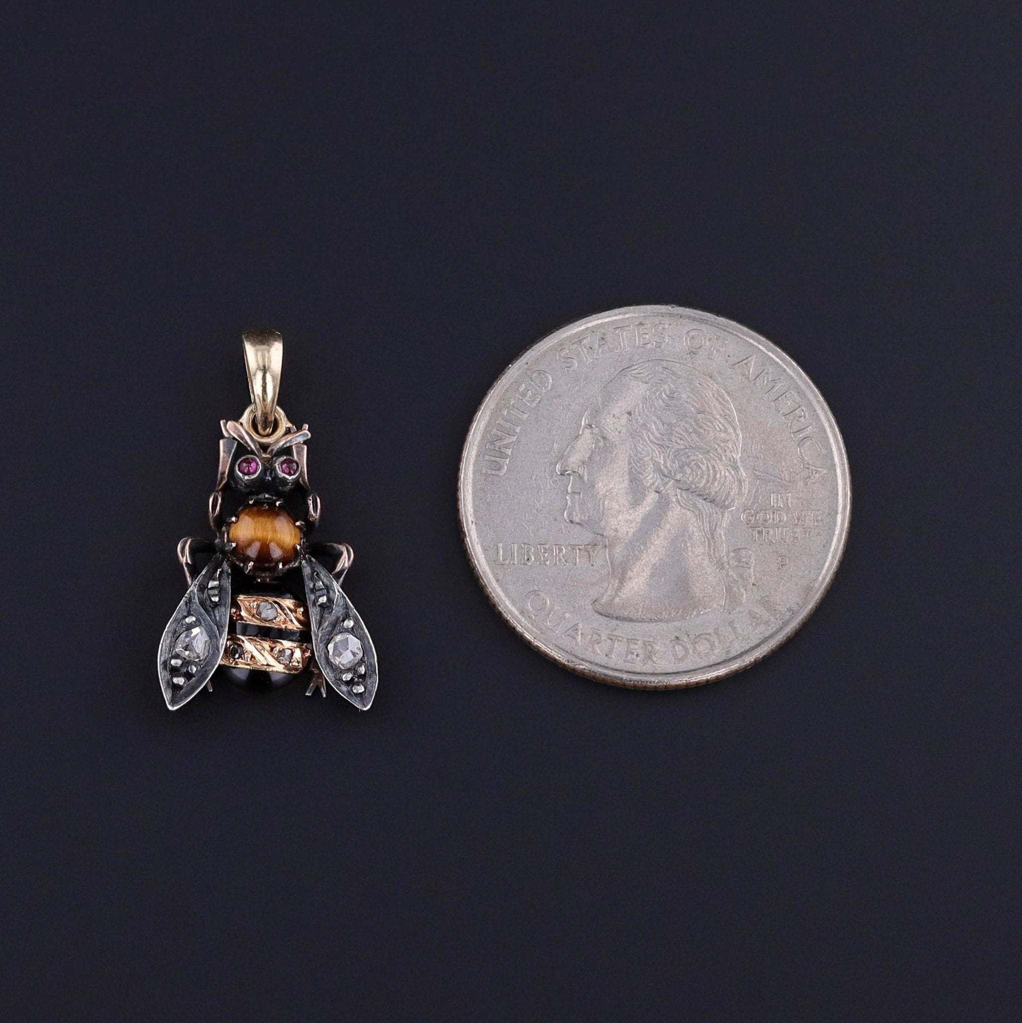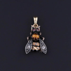 Antique Bee Pendant: Delve into the enchanting world of the late 19th century with this antique bee pendant showcasing a captivating tiger's eye bee adorned with diamond and silver wings and tiny ruby eyes. The pendant was originally an antique pin (circa 1880-1900) transformed by our talented jeweler into an elegant pendant.