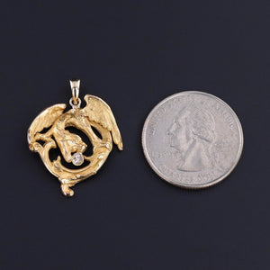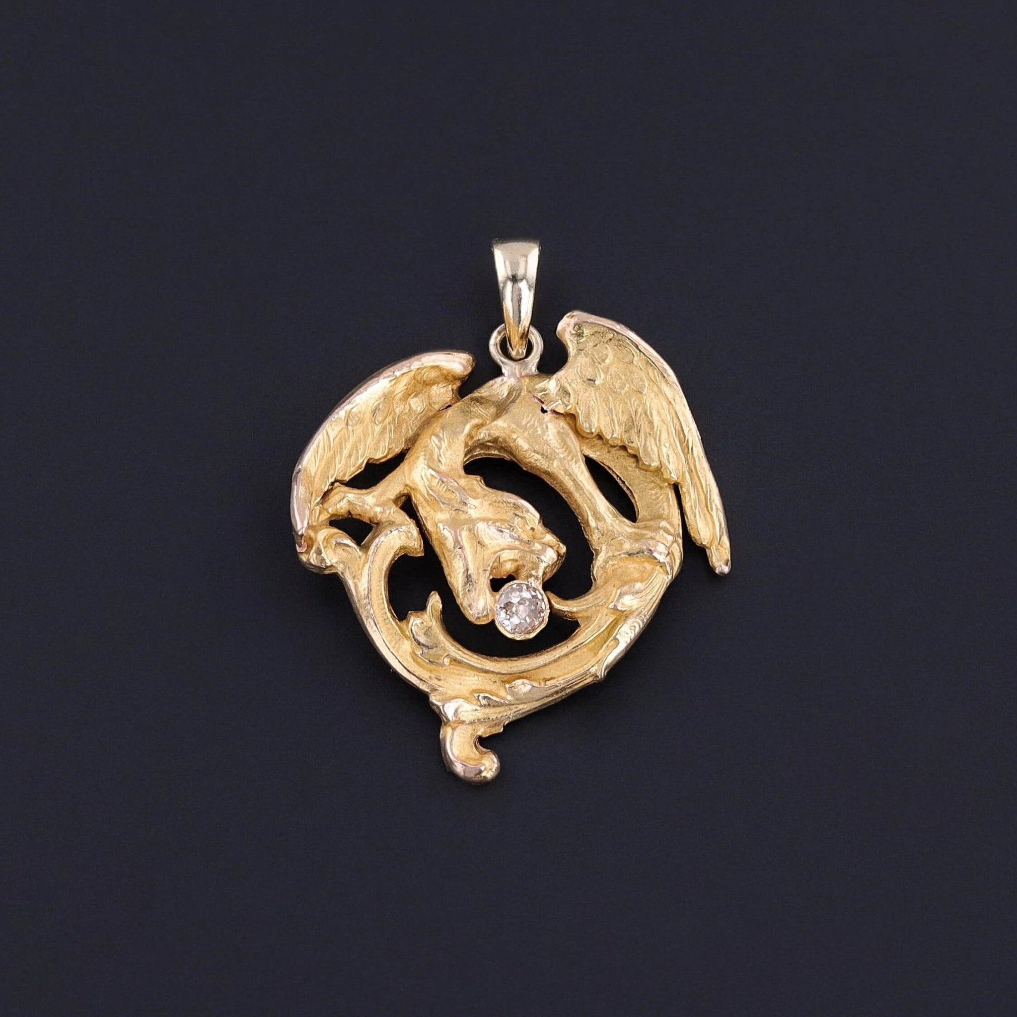 This pendant features a dragon of 18k gold with an old mine cut diamond in its teeth. The piece was originally an antique brooch (circa 1910) that our jeweler transformed by removing the pin findings and adding a 14k gold bail.