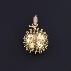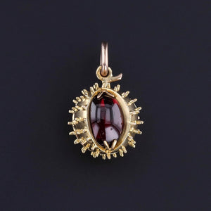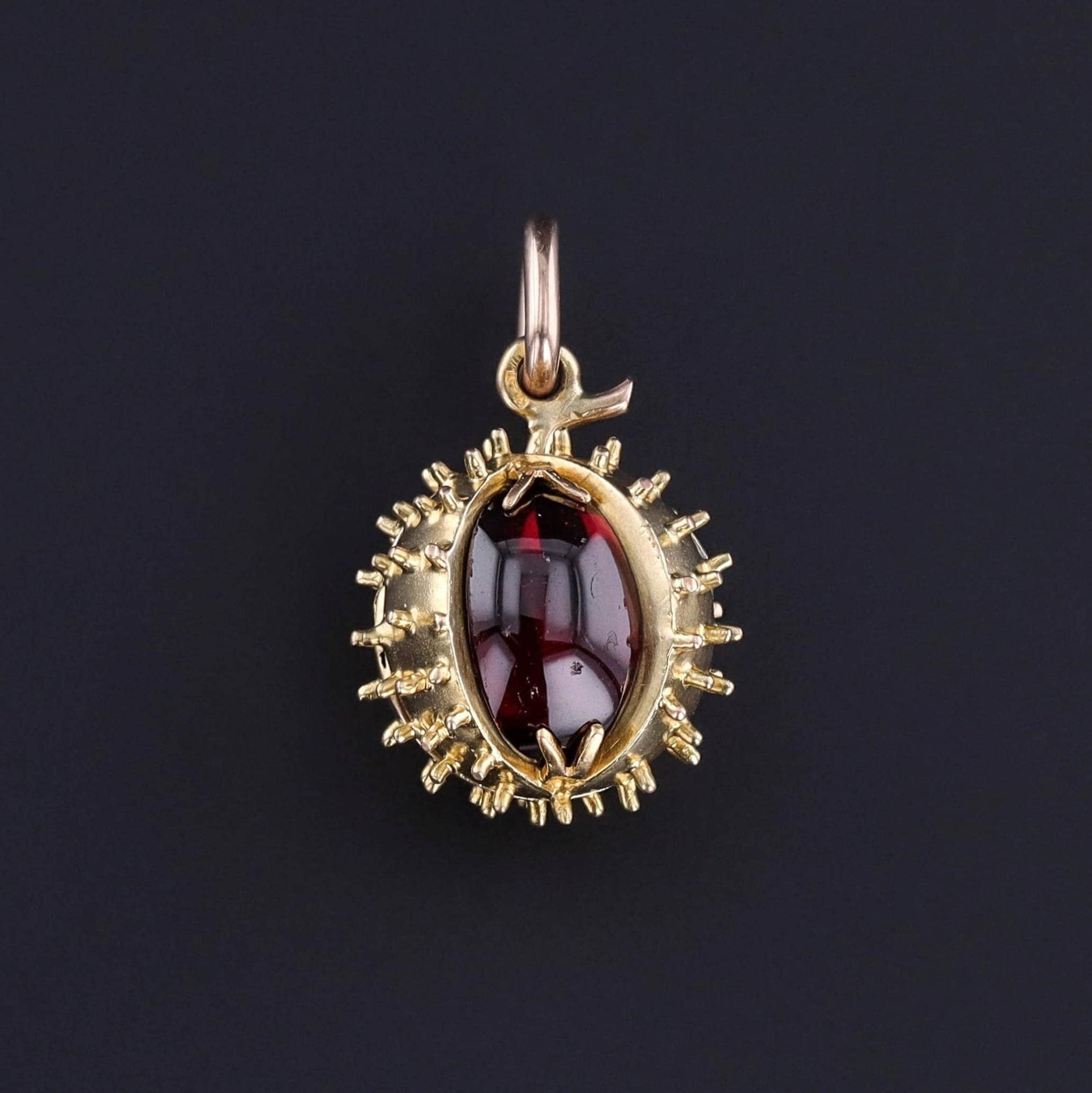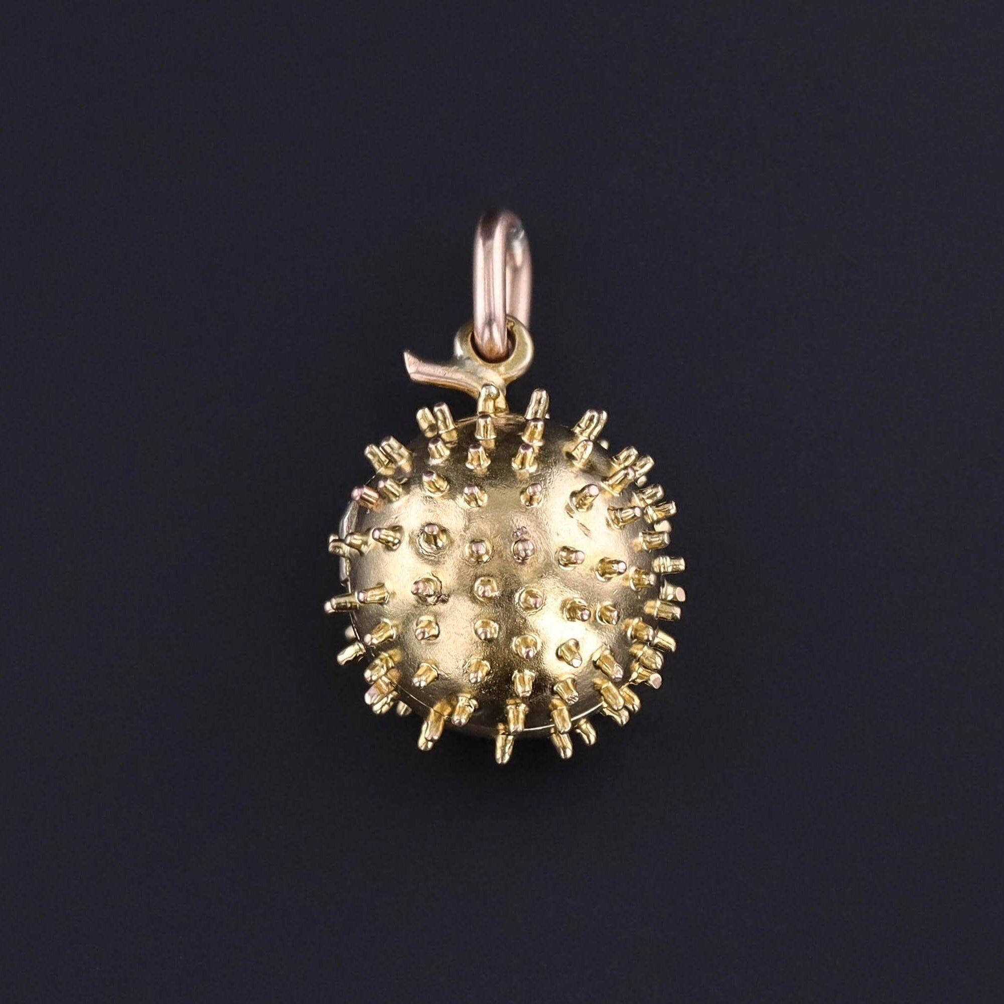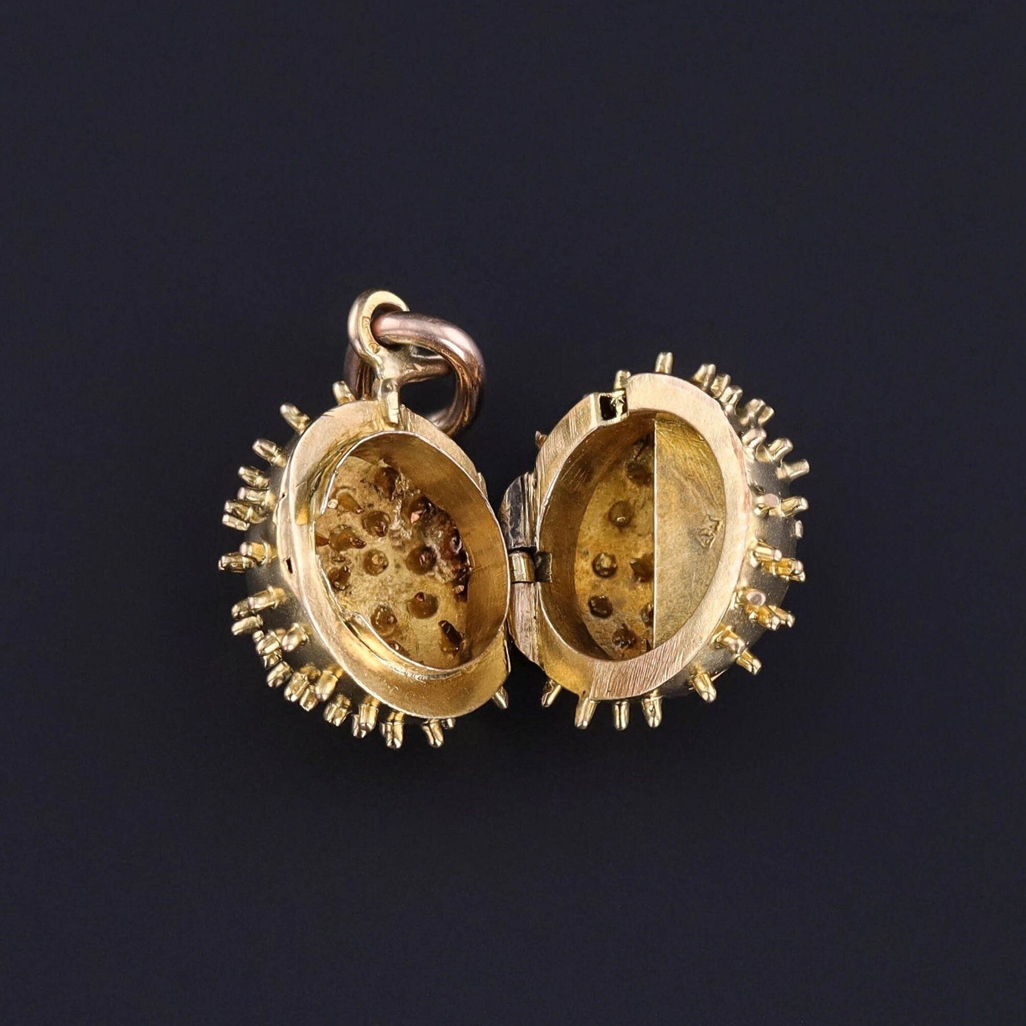 This antique horse chestnut locket dates to the late 1800’s and features a spiked 14k gold shell around a garnet nut.