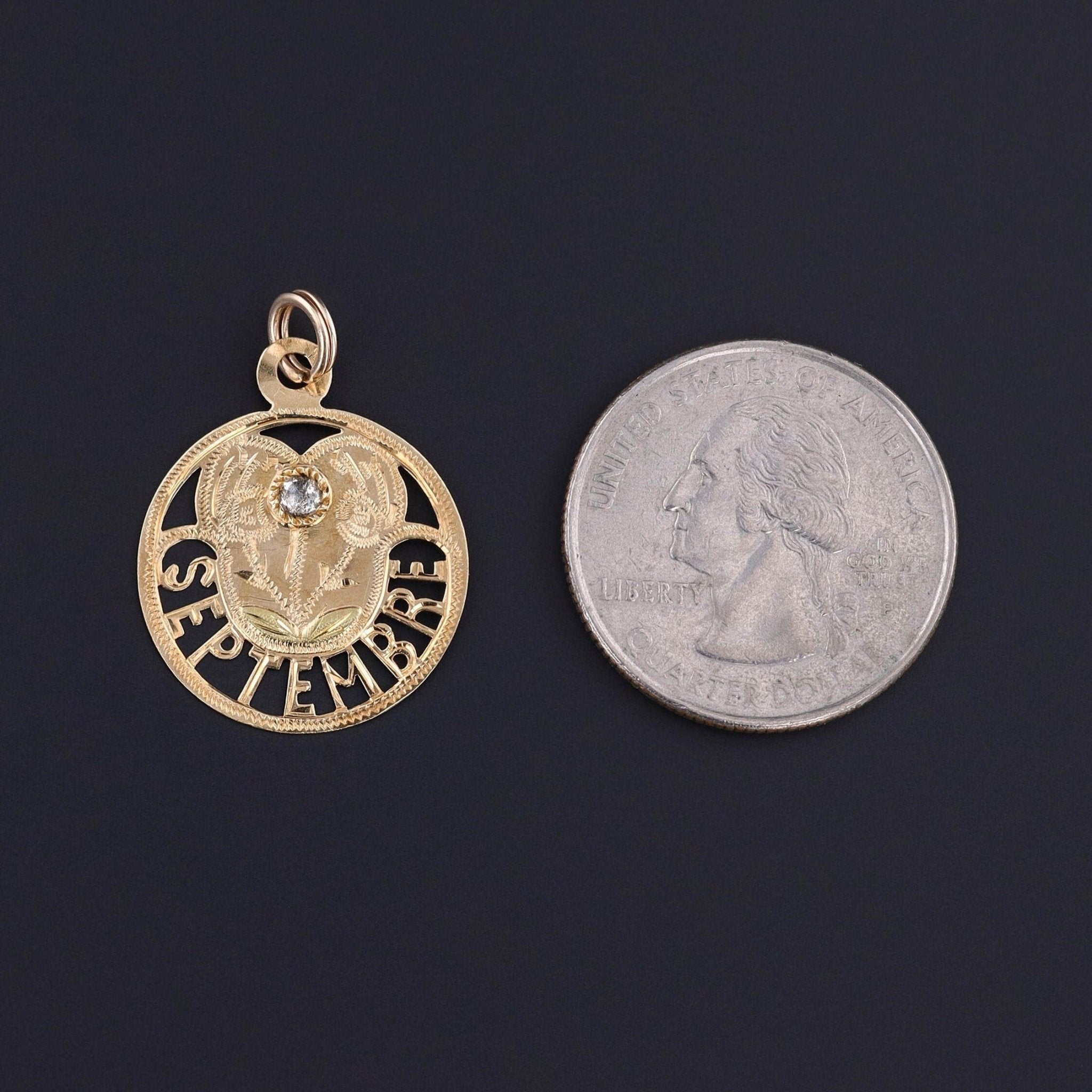 Antique September Charm: An 18k gold pendant (circa 1890) with the word 'Septembre' (September) beneath a rose cut glass flower.