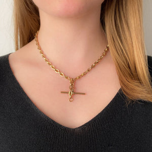 This substantial antique watch chain (circa 1865-1880) features links of 9ct gold with a bolt ring, swivel clasp, and a t-bar.