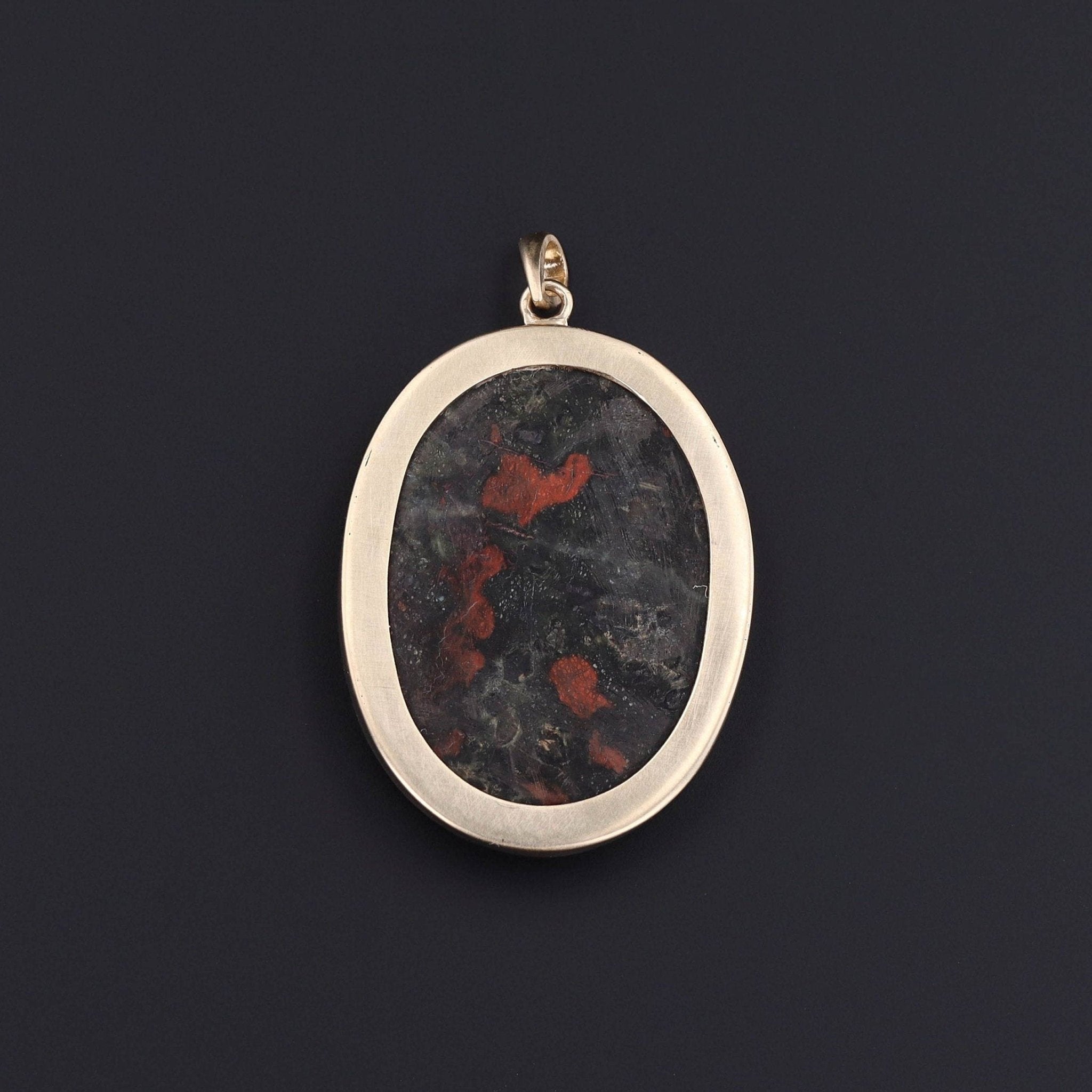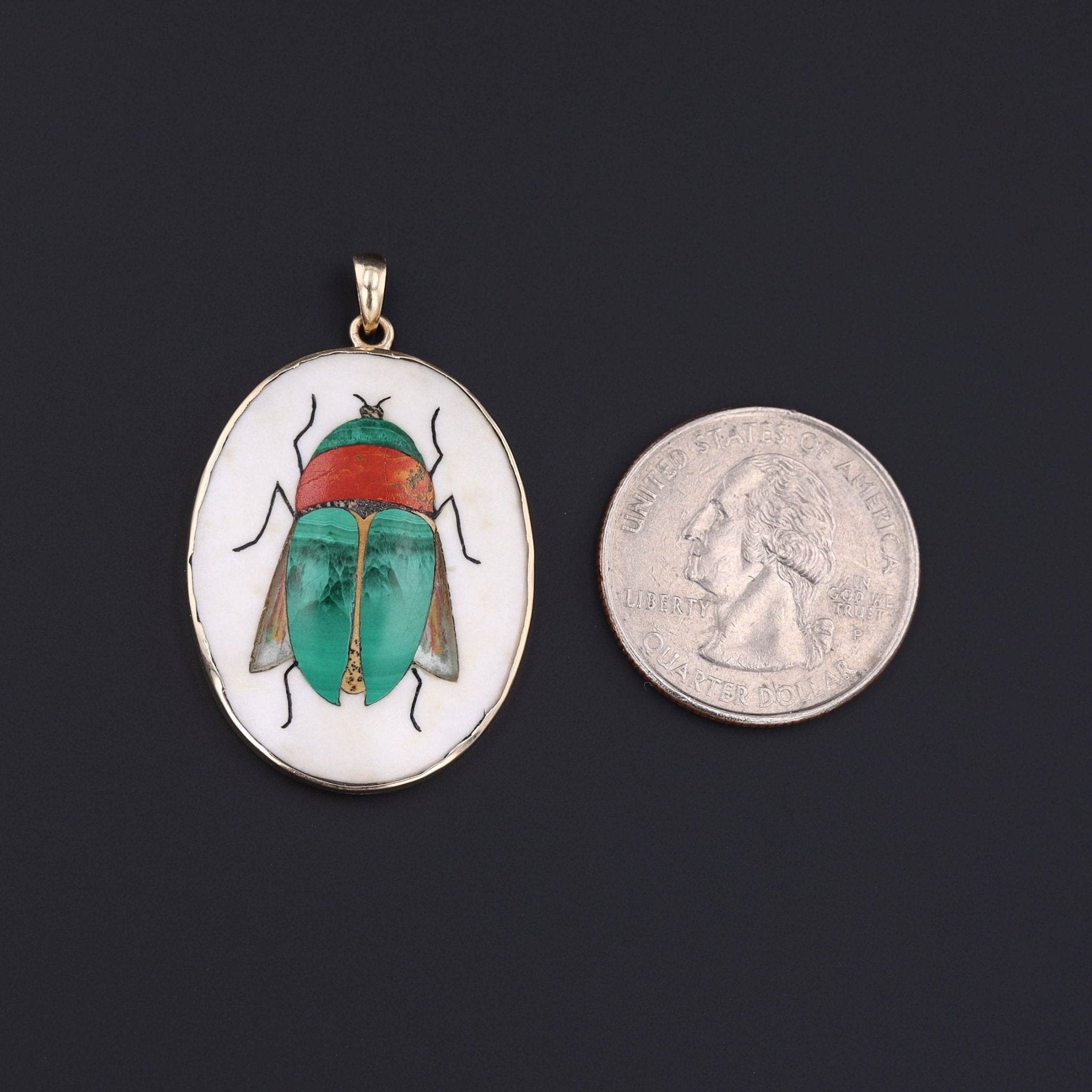 This pendant was converted from an antique brooch (circa 1880) by removing the pin and adding a gold bail. If features a green beetle of malachite, agate, and jasper set against white marble with a bloodstone backing.