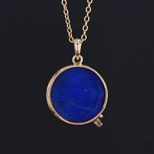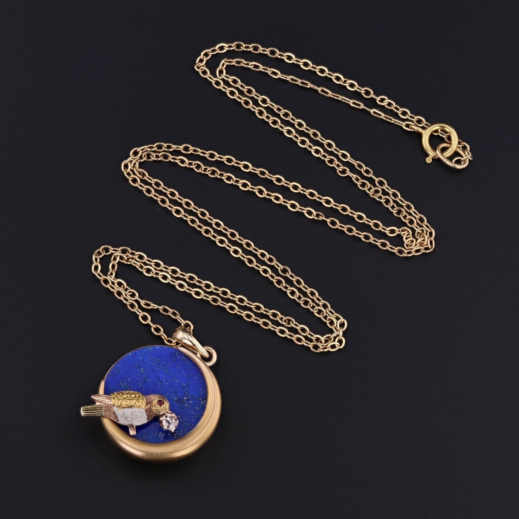 Our jeweler created this unique pendant by combining antique and vintage jewelry components. The bird and crescent are 14k gold and date to the early 1900s, and our jeweler mounted them atop a vintage 1960s era lapis lazuli cufflink. The bird has a tiny red glass eye and holds a diamond in its beak.