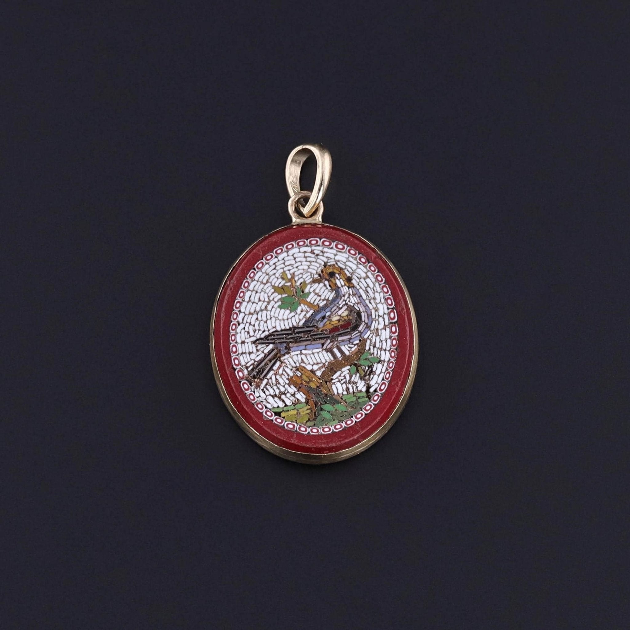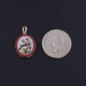 Victorian Micromosaic Bird Pendant: This 14k gold pendant (circa 1840) features a micromosaic depicting a bird atop a branch.