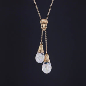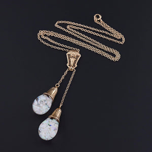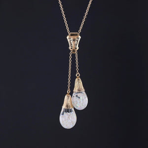 An antique floating opal lariat necklace by the original designer, Horace Welch. This 1920s era piece is mounted in 14k gold with asymmetrical drops. The top of each drop is stamped "PATS Pending" which refers to the patent by Horace Welch.
