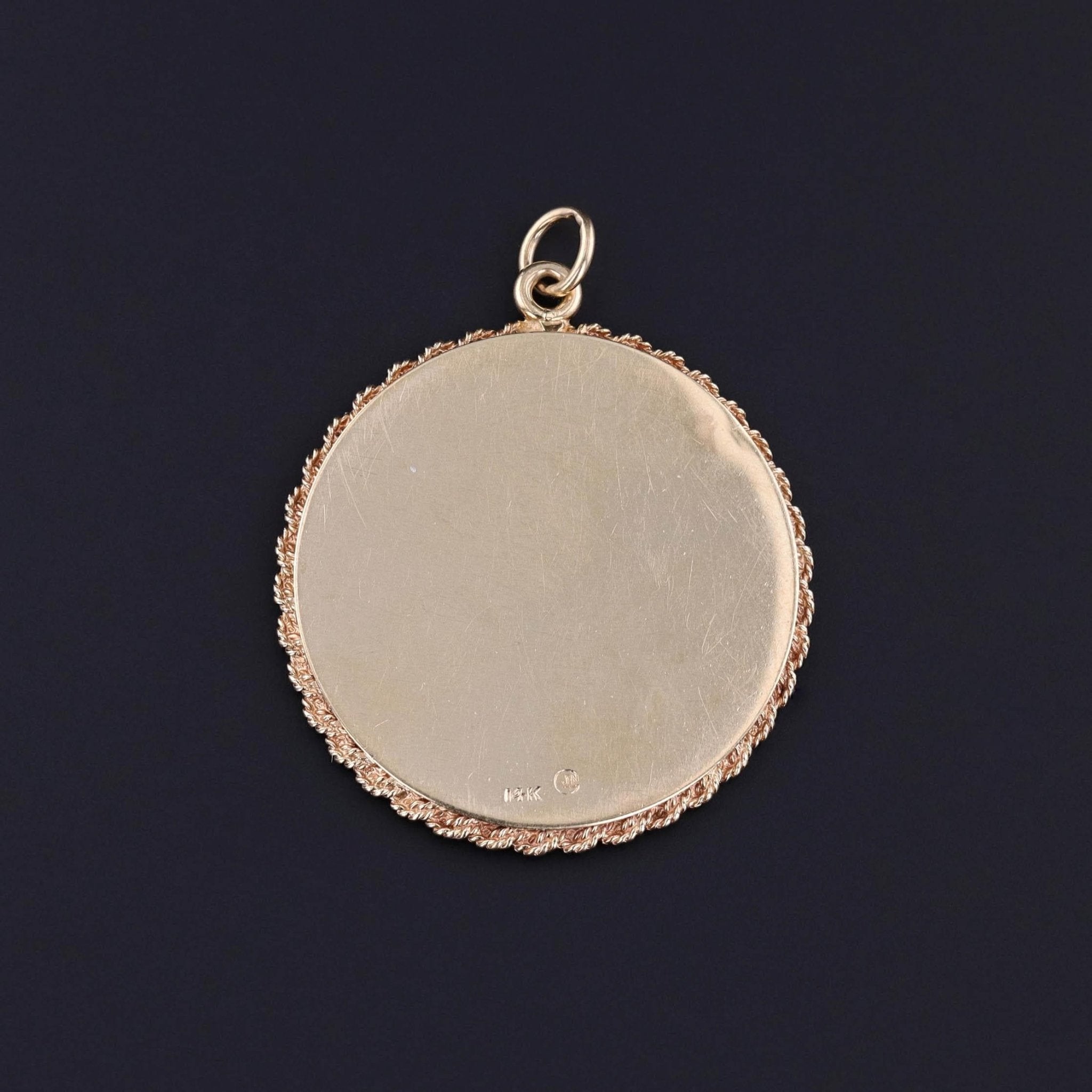 The piece measures 1.7 inches from the top of the bail to bottom by 1.4 inches wide and weighs 12.3 grams. It is in great condition.