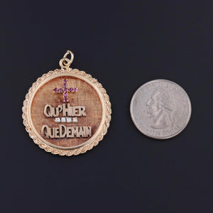 Vintage Qu'Hier QueDemain Pendant: This 14k gold pendant (circa 1960-1980) features a ruby plus and a diamond minus with the French words Qu'Hier and Que Demain which translates to "More than Yesterday, less than tomorrow."