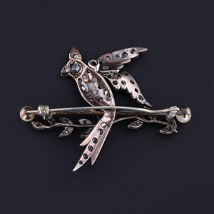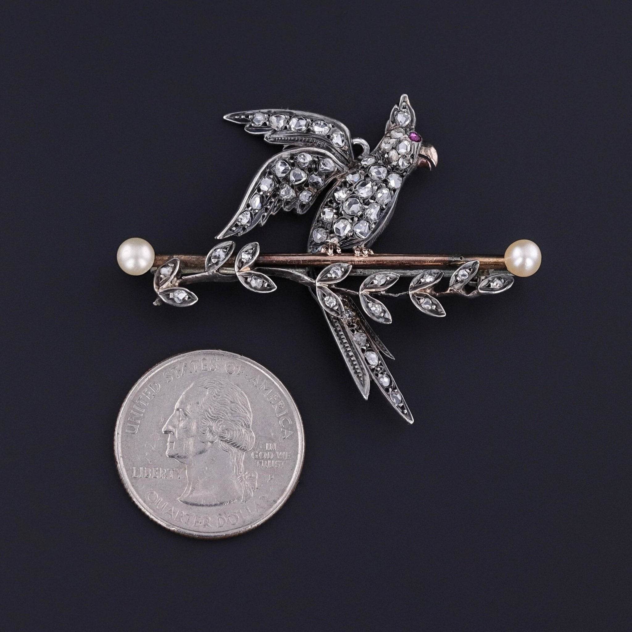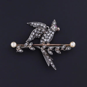 This enchanting Victorian era brooch (circa 1880) depicts a finely detailed parrot, its form crafted in silver and set with glittering diamonds. The bird perches gracefully on a 9ct rose gold bar adorned at each end with a luminous pearl. A discreet ring allows the piece to be worn as either a brooch or a pendant, offering versatility in styling.