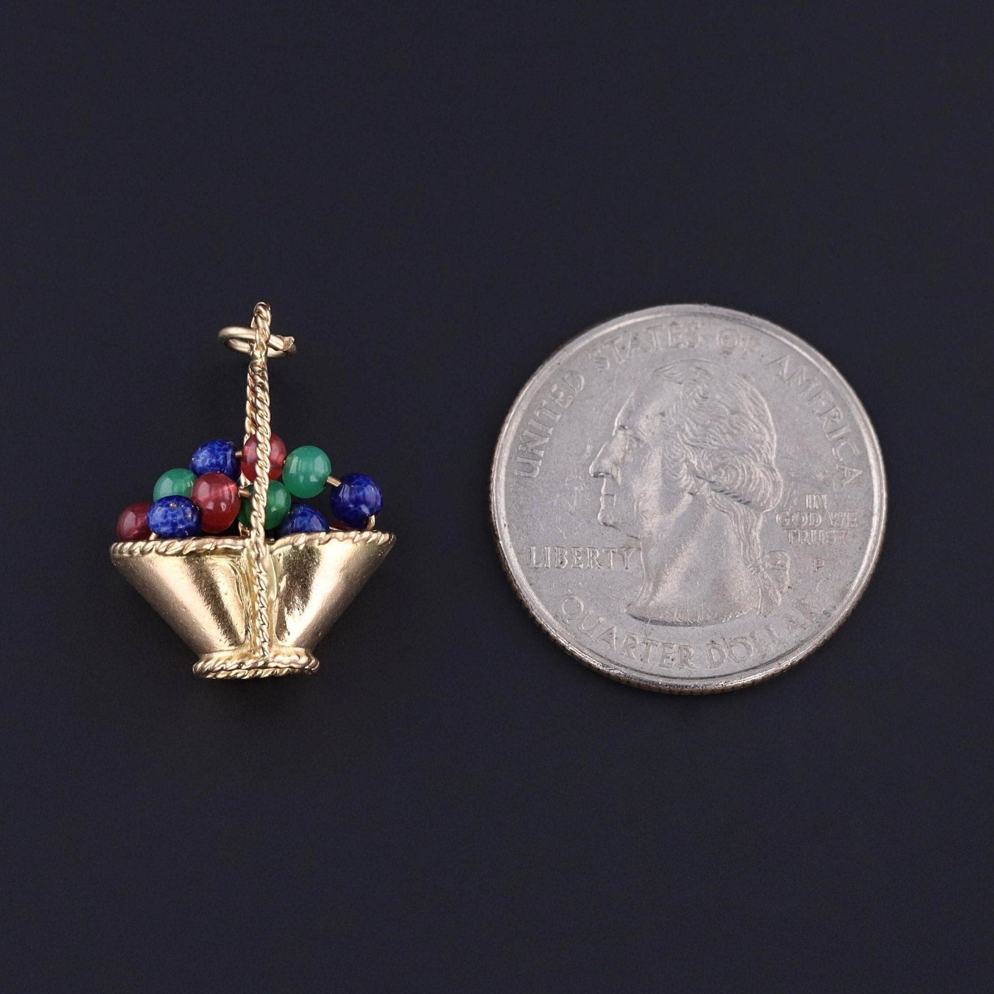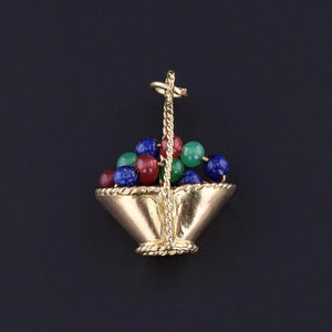 This delightful vintage charm (circa 1950–1960) features a finely crafted basket composed of rich 18k gold, brimming with colorful blue, red, and green glass beads that evoke a bouquet of blossoms or a bounty of fruit. The intricate basket showcases skilled goldsmithing with its detailed woven texture and gracefully curved handle, lending the piece a charming dimensionality and timeless appeal.