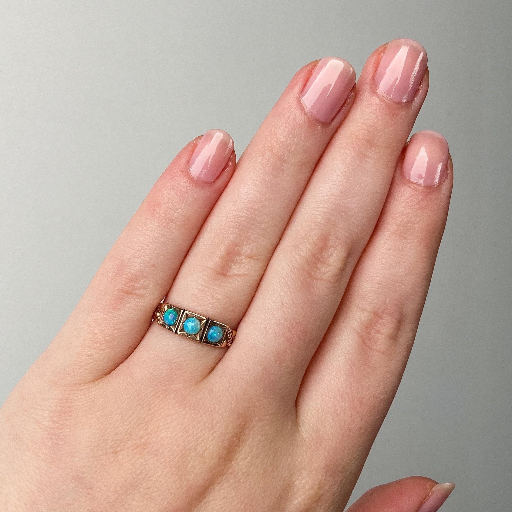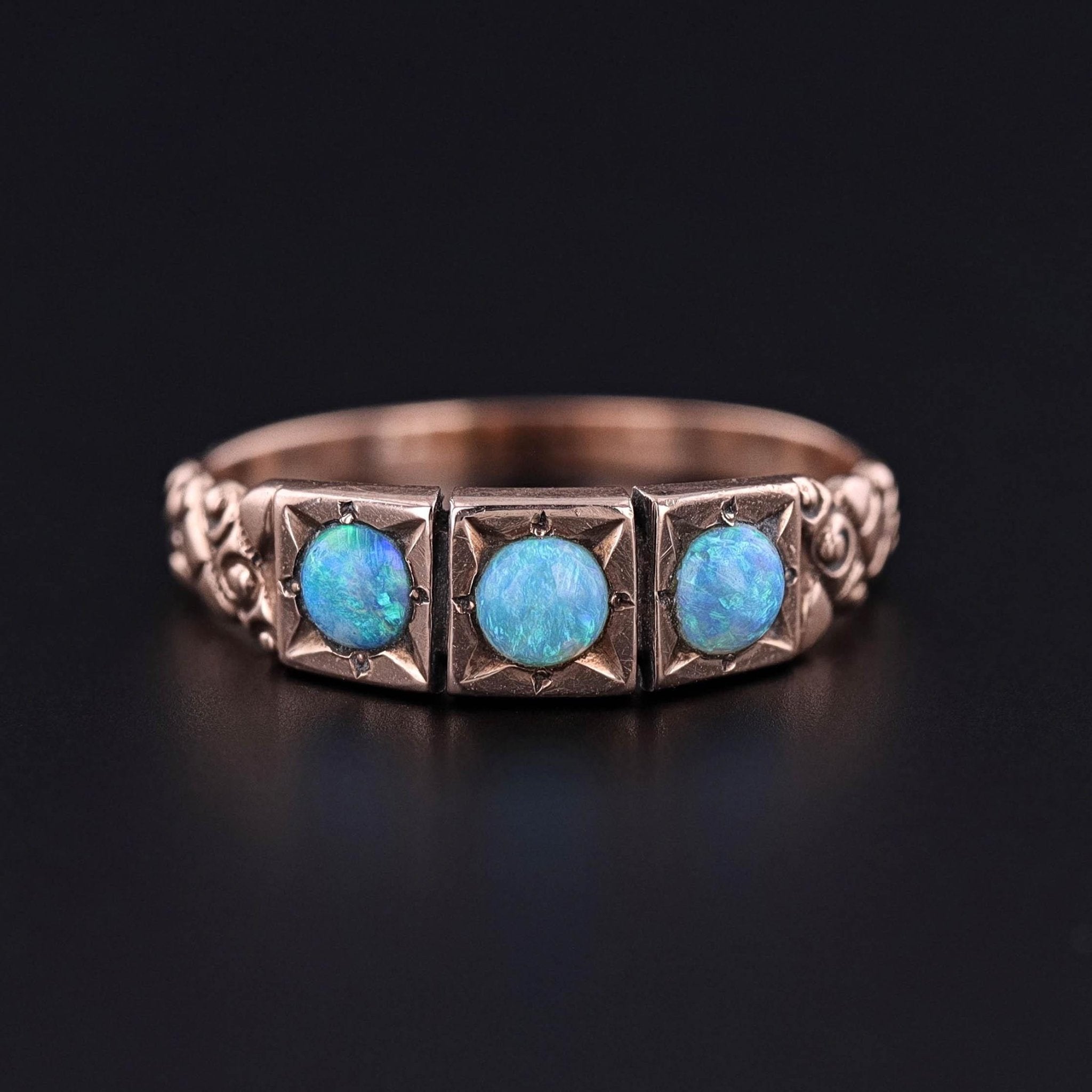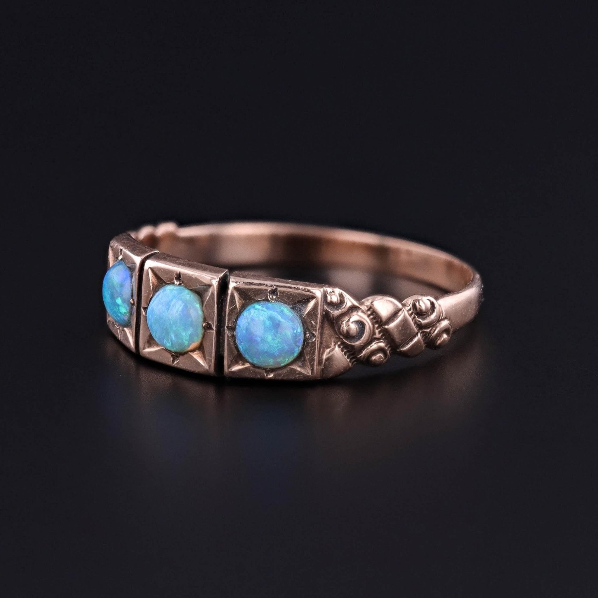 Antique Opal Ring: This antique band (circa 1900-1915) features three fiery opals set in beautifully 10k gold.