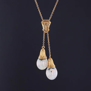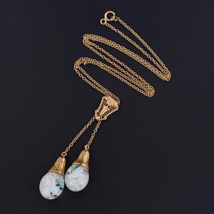Art Deco Floating Opal Necklace: An antique floating opal lariat necklace by the original designer, Horace Welch. This 1920s era piece is mounted in 14k gold with asymmetrical drops. The top of each drop is stamped "PATS Pending" which refers to the patent by Horace Welch.