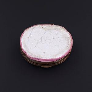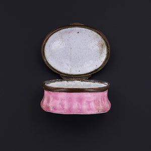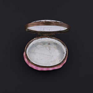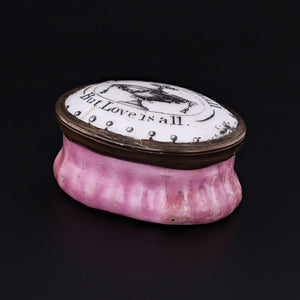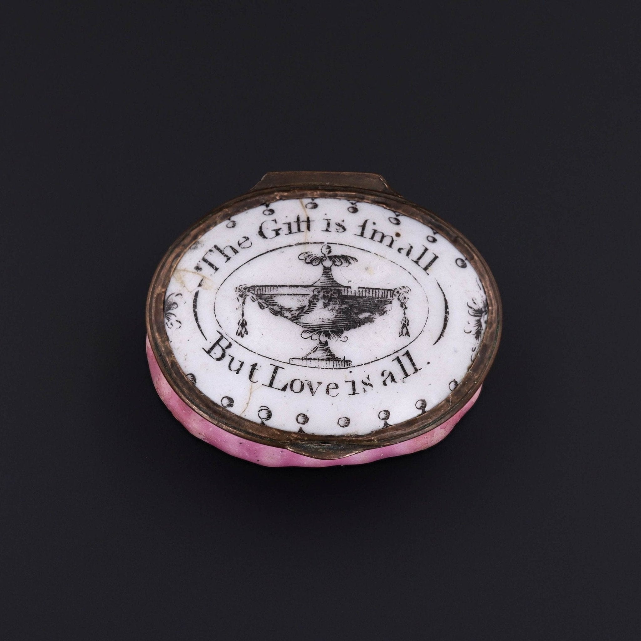 This Georgian patch box (circa 1780) features pink and white enamel on base metal. The top of the box depicts an urn with the phrase 'The Gift is fmall (old English 'small') But Love is all.'.