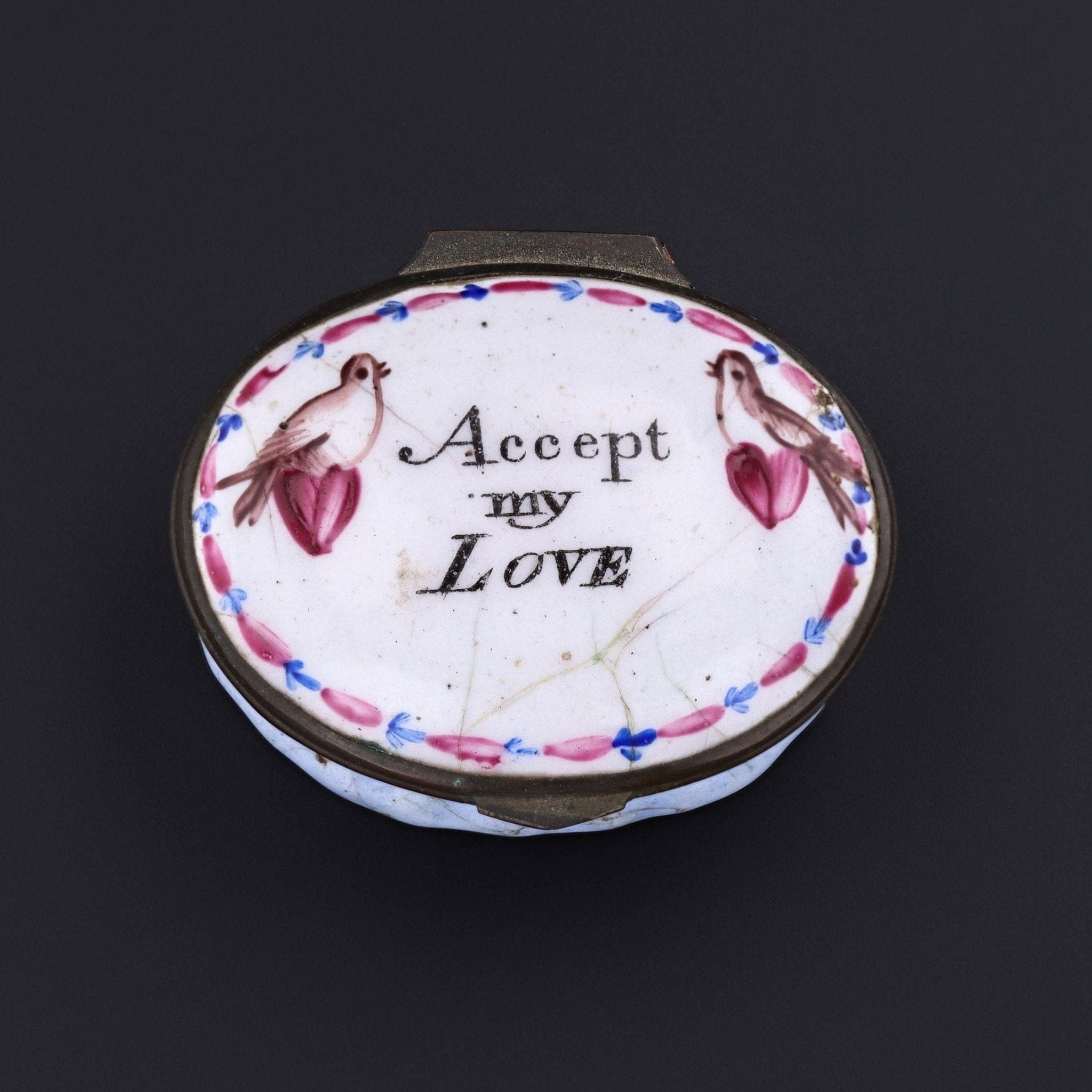 This antique patch box features light blue enamel with the quote, 'Accept my Love' among two hand painted birds perched on pink hearts. The piece is in great condition with minor hairline cracks in the enamel. It would be a wonderful love token for someone special.