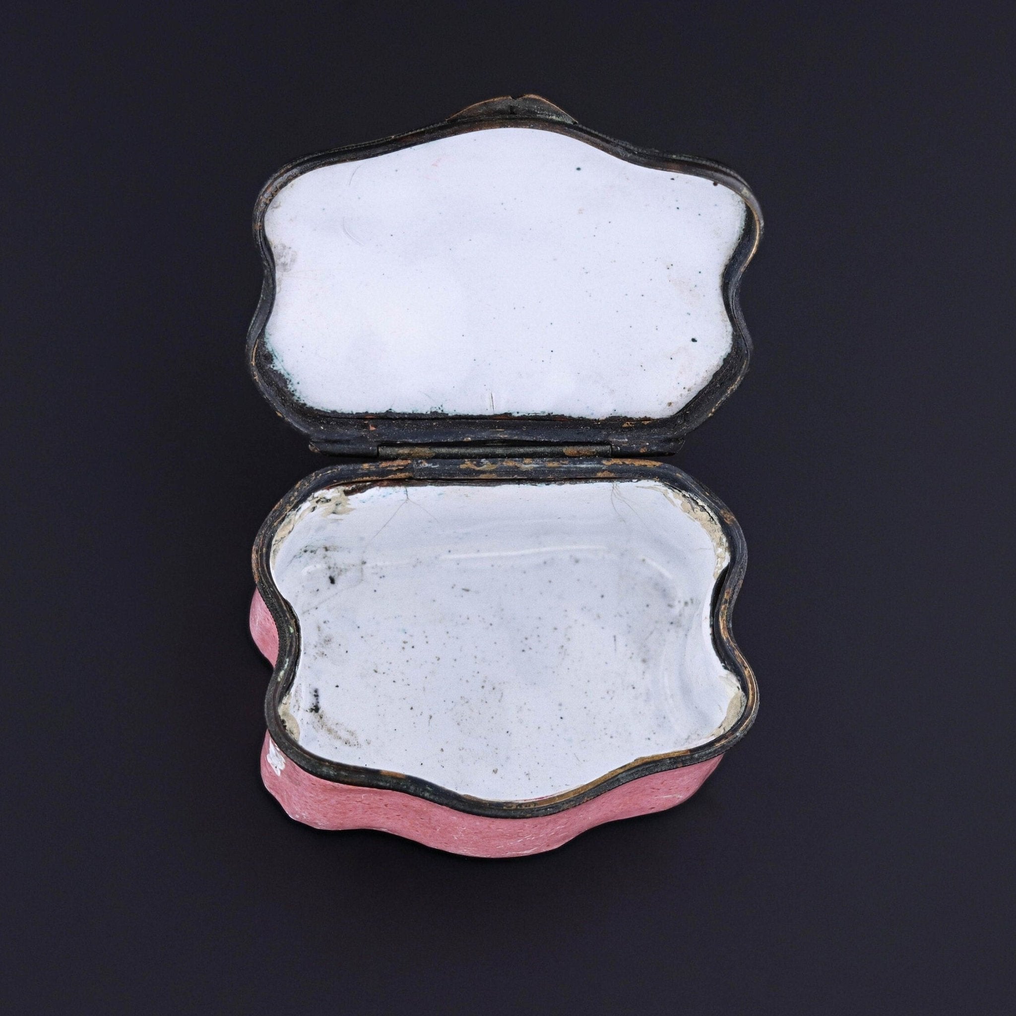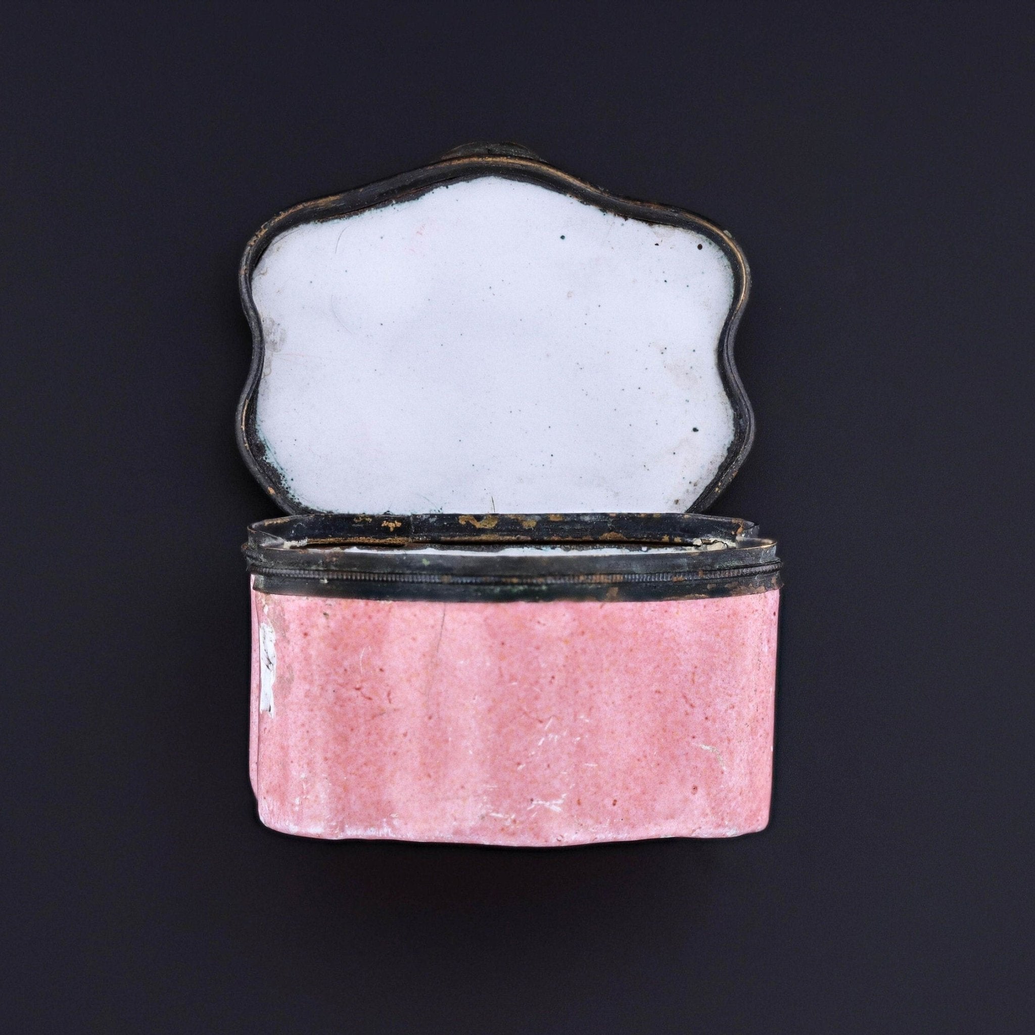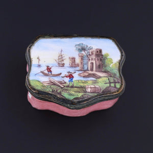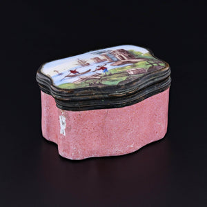 Step into the elegance of the late 18th century with this enchanting Georgian patch box (circa 1780–1800). Crafted in porcelain and adorned with a soft pink enamel exterior, the box is crowned by a finely hand-painted pastoral scene, likely inspired by an Italian port, complete with gentle architectural lines and serene waterside charm.