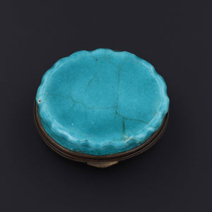 This antique patch box features turquoise enamel with the quote, 'We live in HOPE' among enamel greenery and a hand painted urn. The piece is in good condition with minor chips and hairline cracks in the enamel.