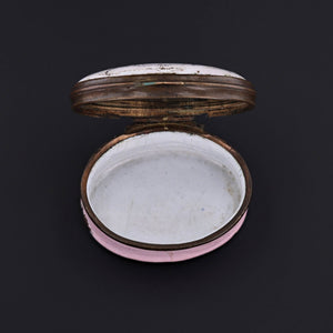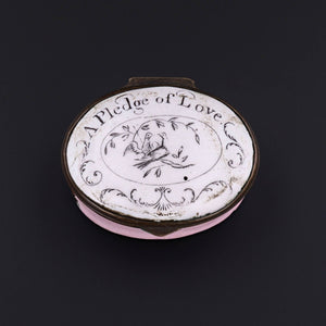 This antique patch box (circa 1780-1800) features two birds on a branch beneath the phrase 'A Pledge of Love.'