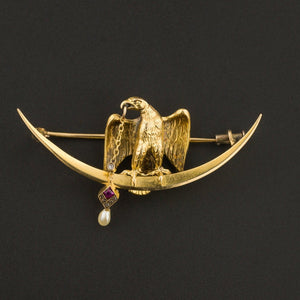 Bold and symbolic, this finely wrought Victorian brooch (circa 1880) depicts a regal falcon perched upon a crescent moon, grasping a gem-studded chain in its beak. The dynamic design reflects the Victorian fascination with celestial and natural motifs, with the falcon symbolizing power and vision, while the crescent moon embodies femininity and renewal.