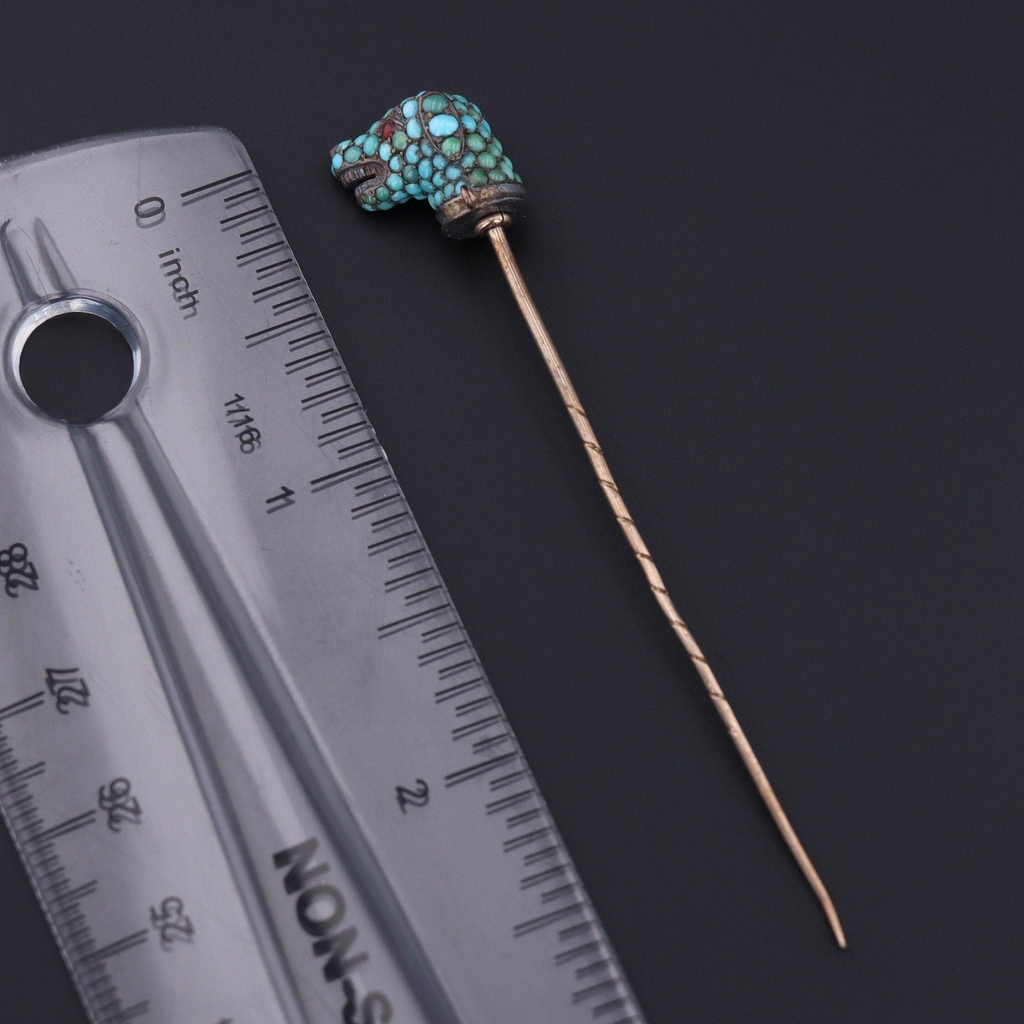 The pin head measures 0.5 inches by 0.63 inches wide, while the full length of the pin extends to 3 inches. It remains in good antique condition, exhibiting a gentle patina to the silver and a subtle waviness to the 14k gold pin stem, both consistent with its age and history.