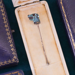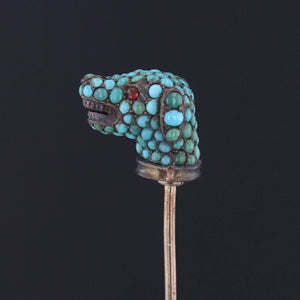 Celebrate the charm and character of Victorian-era craftsmanship with this finely detailed antique stickpin, featuring a beautifully rendered silver dog adorned with vibrant turquoise cabochons and striking red glass eyes. Every detail — from the textured fur to the expressive face — reflects the meticulous artistry of the late 19th century.