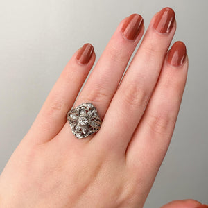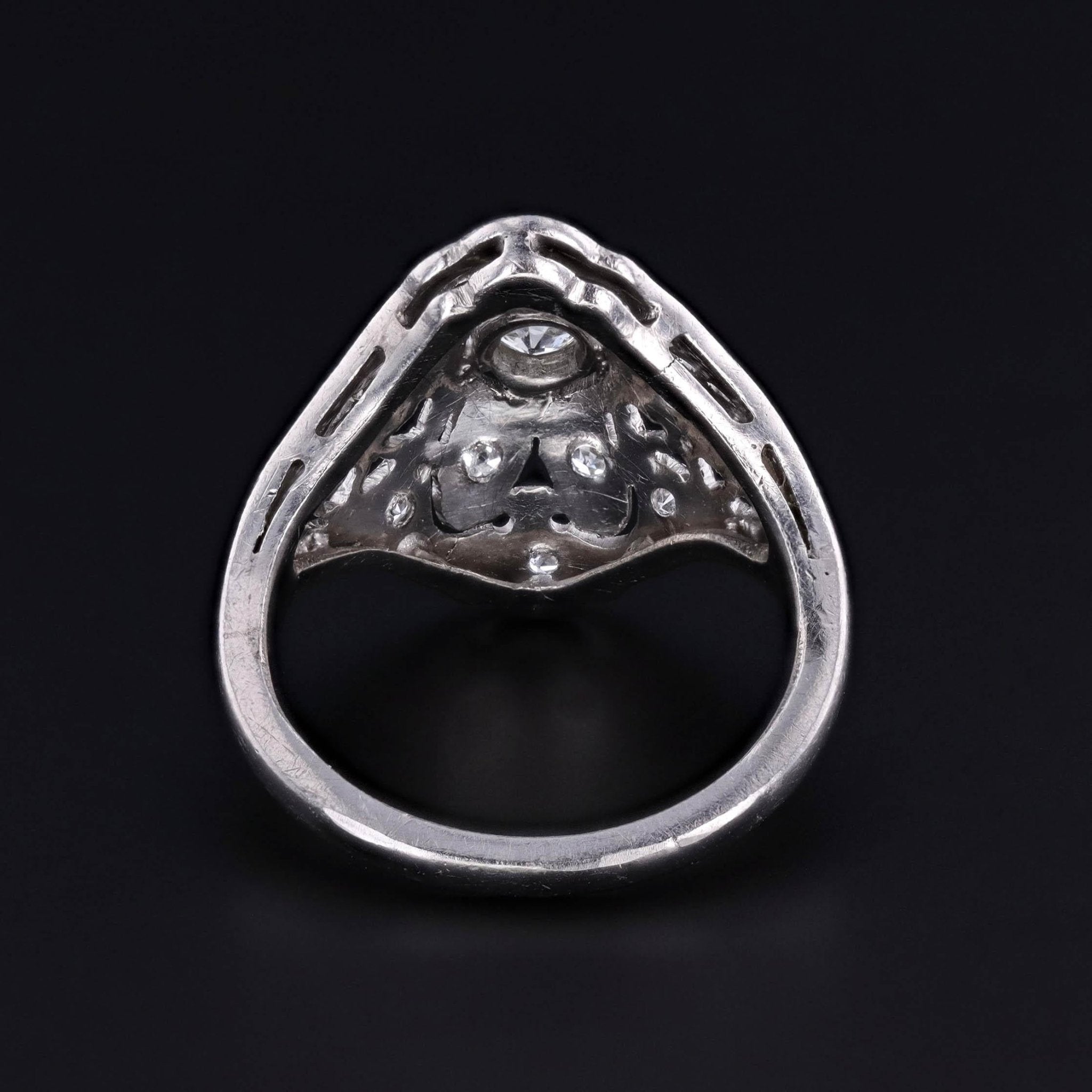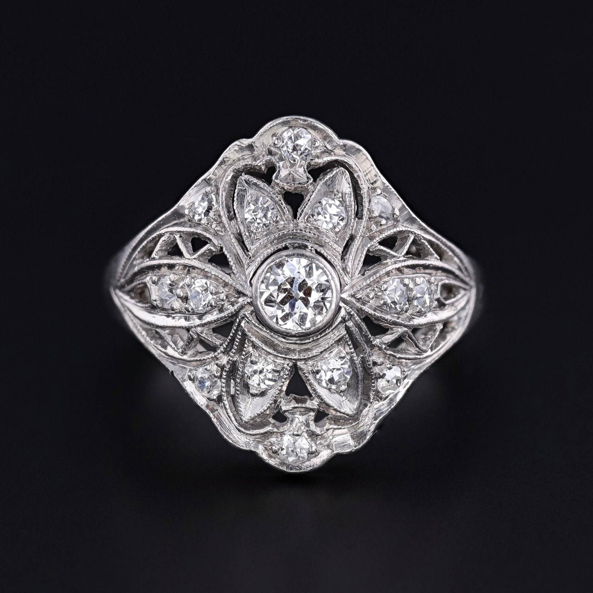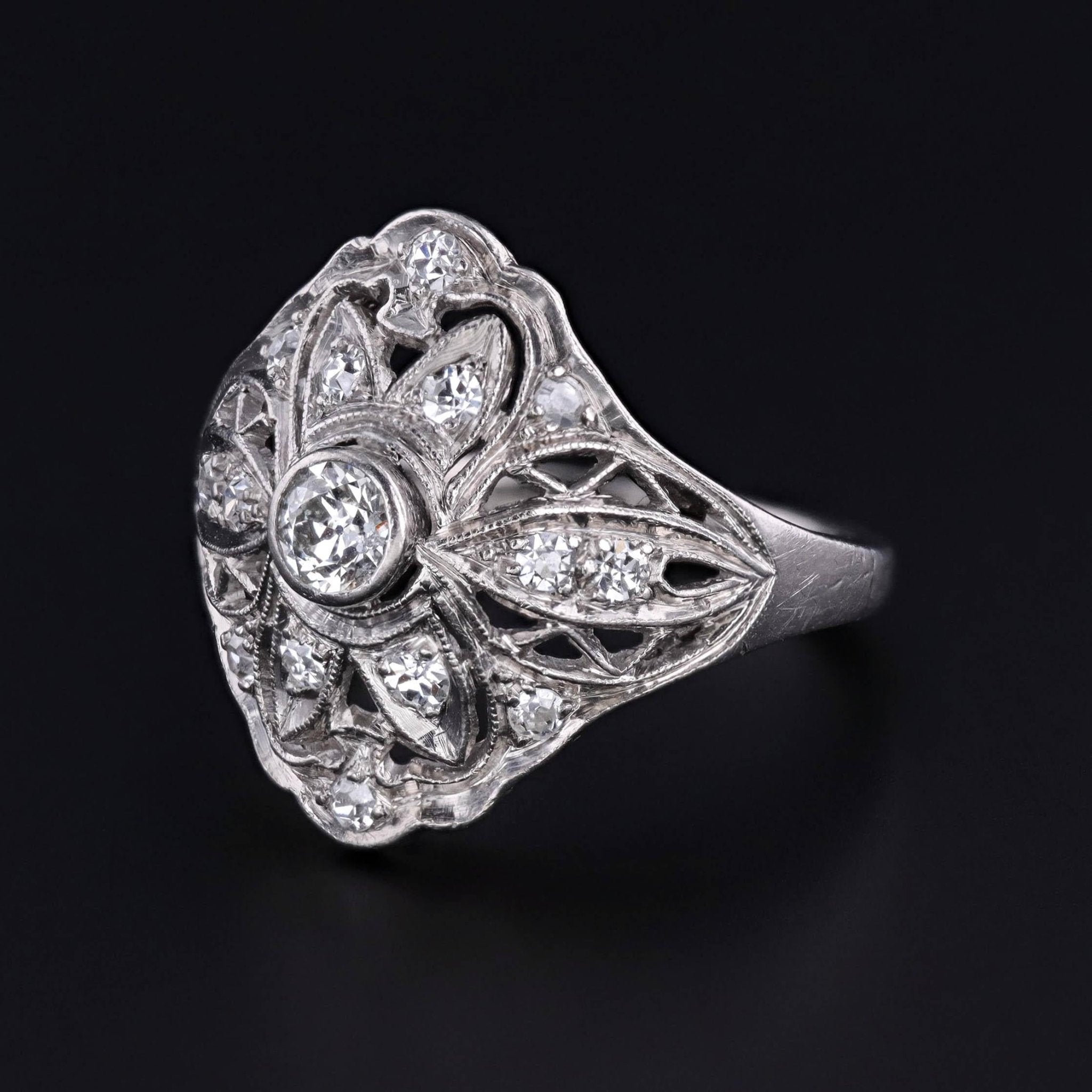This antique Art Deco era filigree bombé ring (circa 1920s–1930s) sparkles with an array of diamonds set in intricate openwork. At the center rests a 0.20ct old European cut diamond (G–I color, SI1 clarity), surrounded by 14 glistening single-cut accent diamonds that enhance the brilliance of the design.
