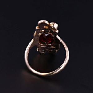 The gold has been professionally verified by XRF analysis and confirmed with traditional jeweler’s acid testing. The ring is in excellent antique condition, with the center garnet being a later replacement stone, adding to its distinctive charm.