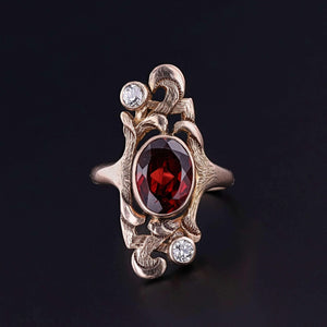 A graceful Art Nouveau ring (circa 1900), featuring an elongated, flowing silhouette inspired by the botanical curves of the period. The design centers on a richly colored malaia garnet, set in warm 10k gold and accented by two sparkling old European cut diamonds that add subtle brilliance.