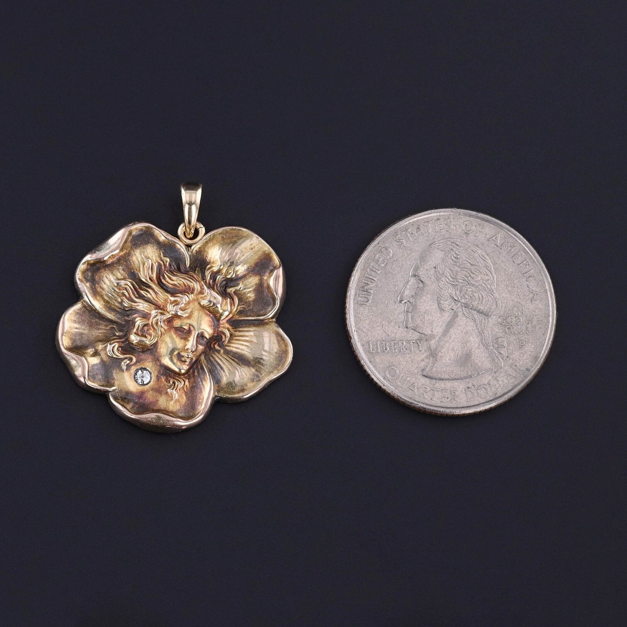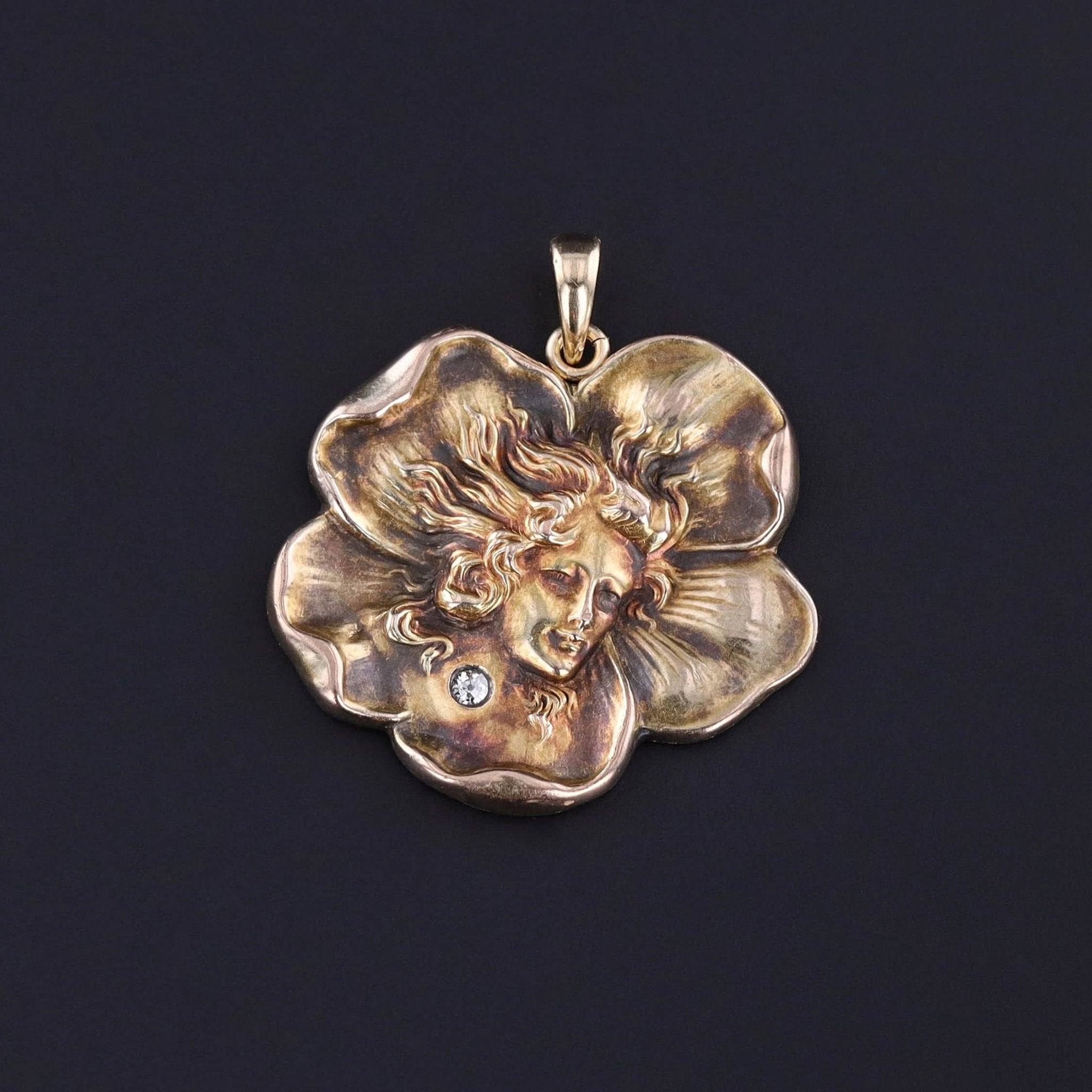 The 10k gold pendant depicts a woman inside of a flower with a tiny diamond accent.