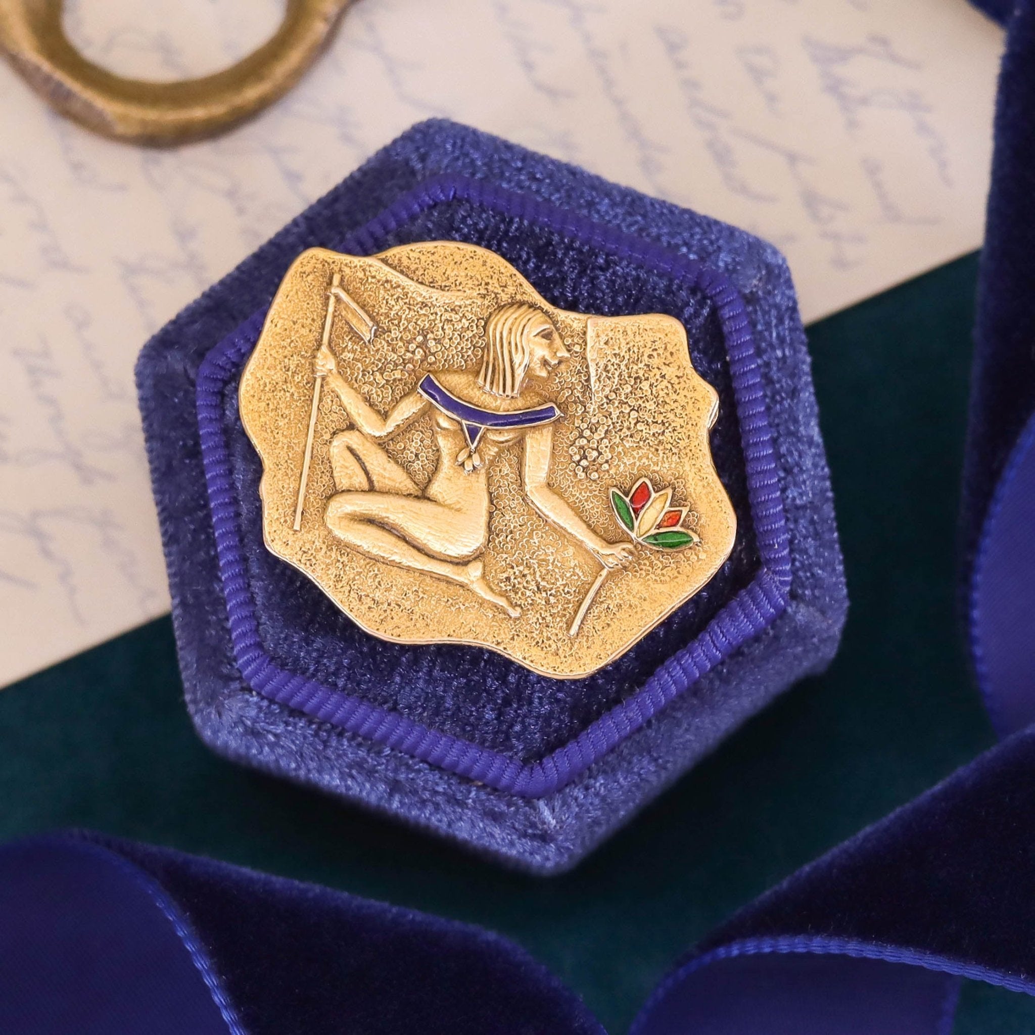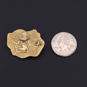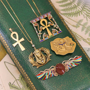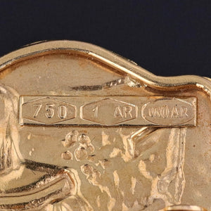 This Egyptian revival brooch (circa 1980) was made by the renowned Italian maker, UnoAErre. The brooch is 18k gold (marked 750) and it measures 1.1 inches from top to bottom by 1.4 inches wide.