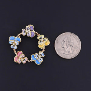 This enchanting vintage jewel (circa 1940–1950) doubles as both a pendant and brooch, showcasing five exquisitely detailed enamel pansies arranged in a floral cluster. Each pansy is adorned with a sparkling diamond accent, their brilliance perfectly offsetting the rich enamel hues.