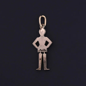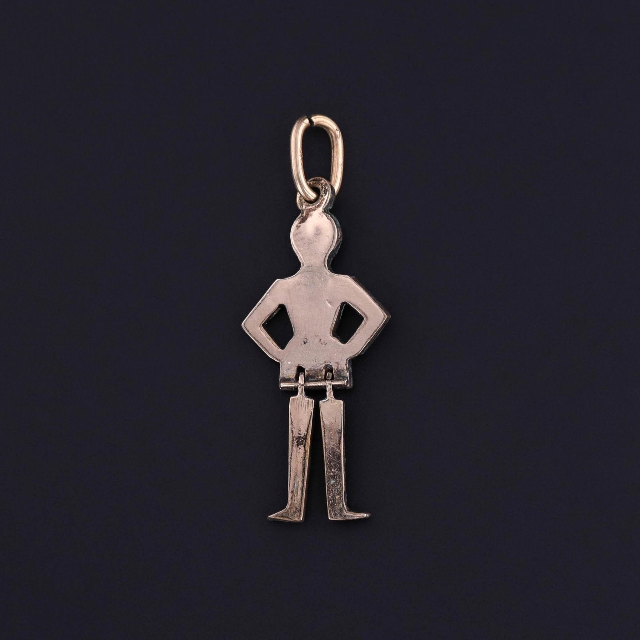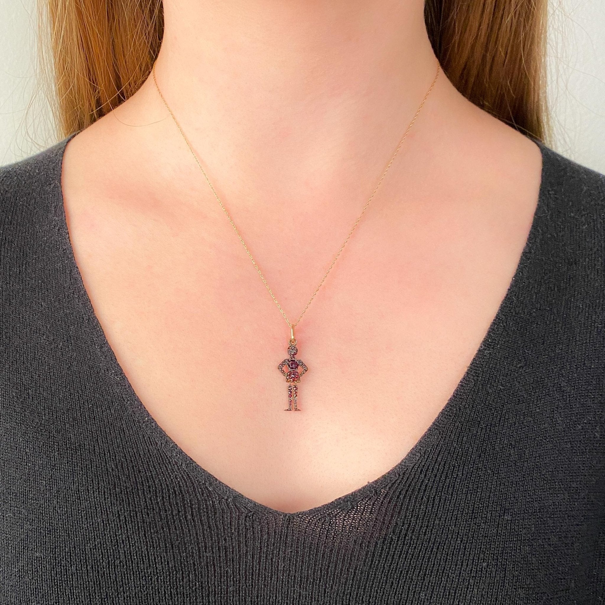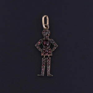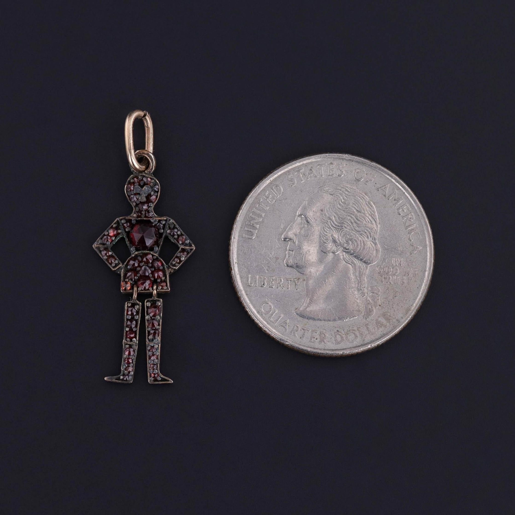 This delightful Victorian-era charm (circa 1870–1890) depicts a whimsical figure composed of deep red Bohemian garnets. Designed with articulated legs that dangle freely, the piece has a sense of movement and playfulness that reflects the creativity of 19th-century jewelry design.
