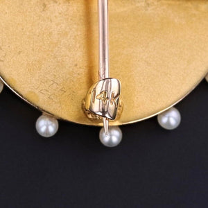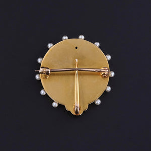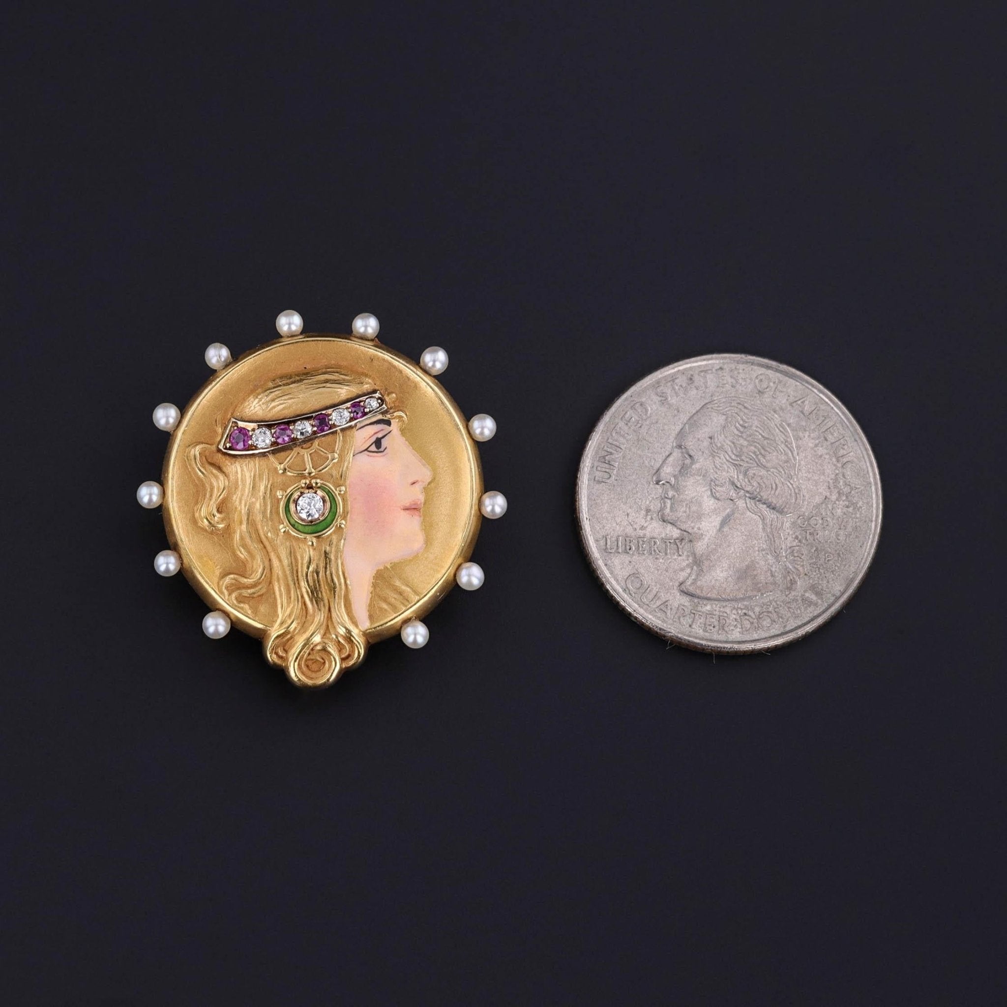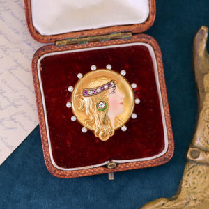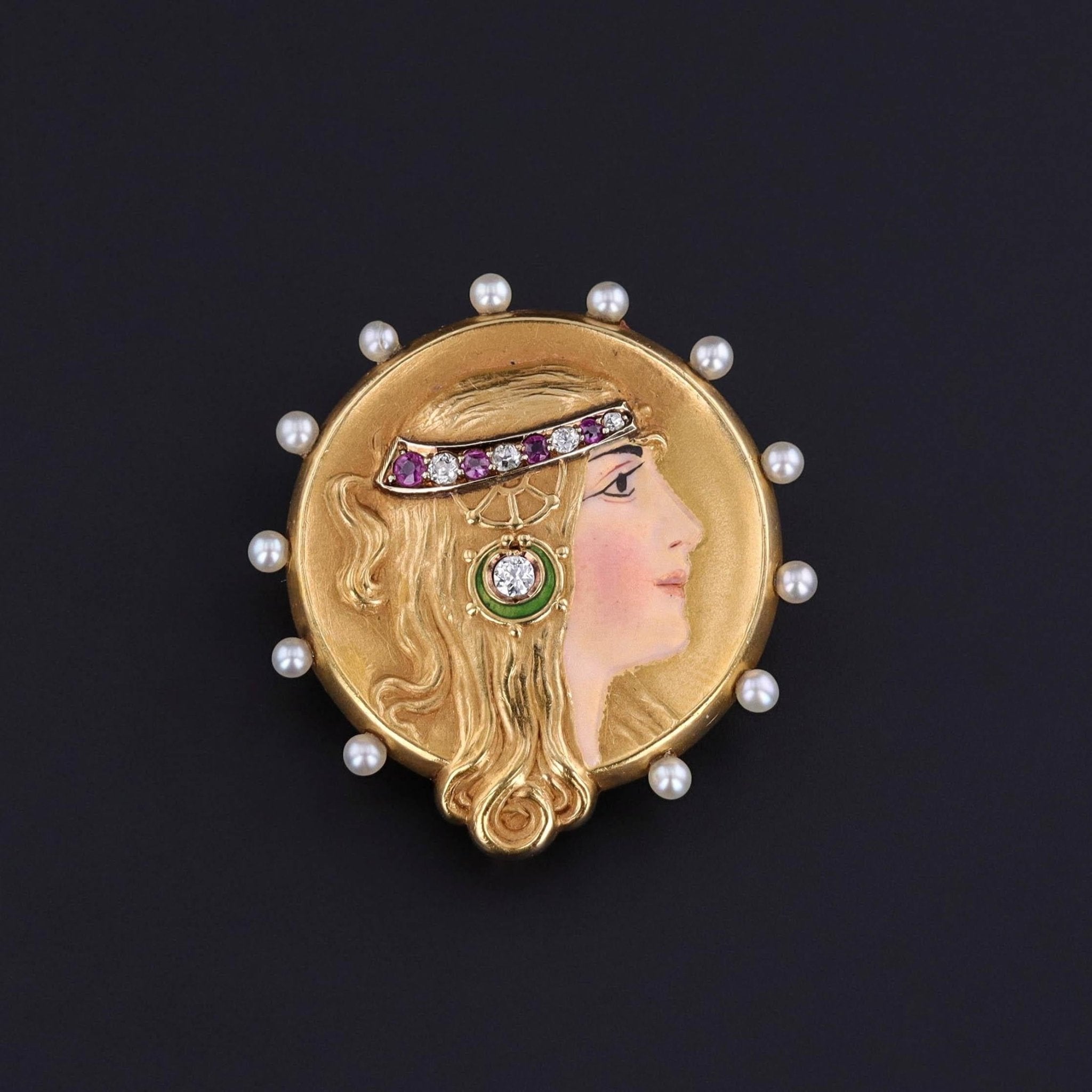 This exquisite Art Nouveau brooch (circa 1900) features a finely enameled woman rendered in 14k gold, her flowing form adorned with pearls, diamonds, and rubies. The jewel exemplifies the sensuality and fluidity of the Art Nouveau era, when artists celebrated feminine beauty, natural forms, and richly colored materials in their creations.
