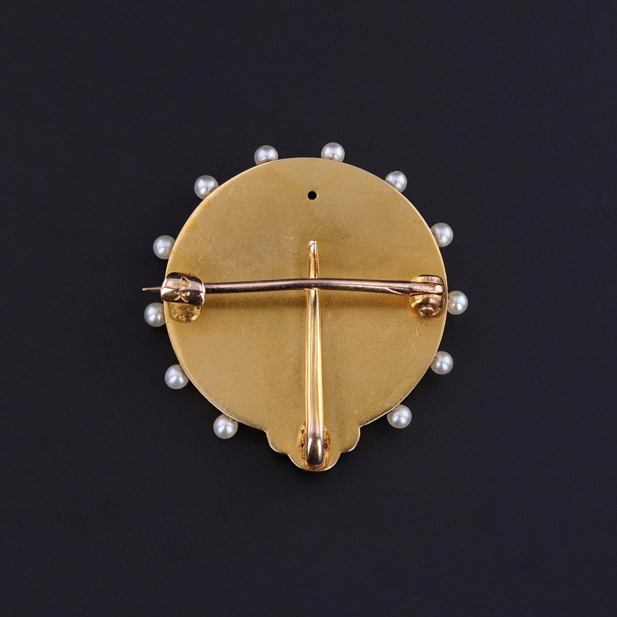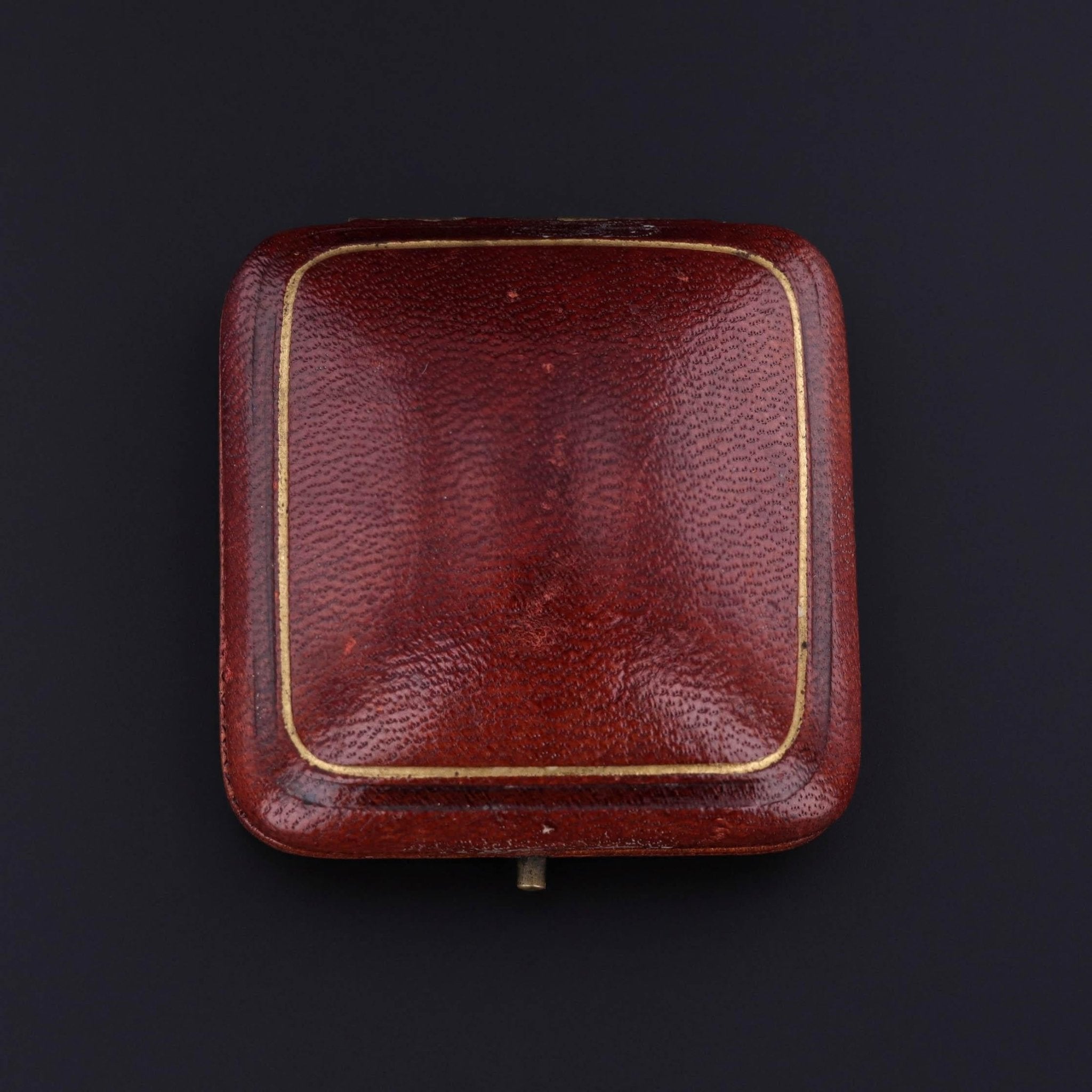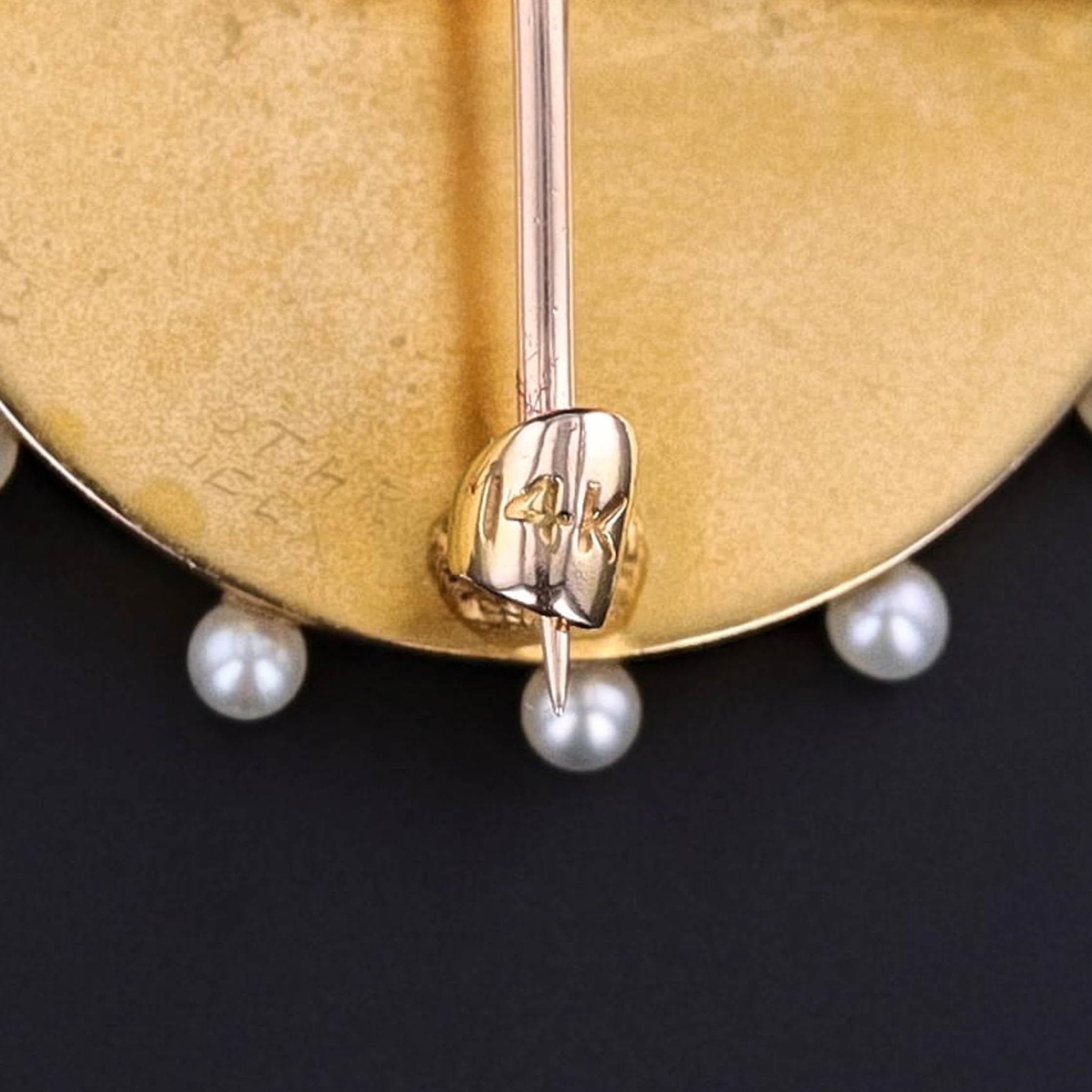 The brooch measures 1.15 inches by 1.1 inches across and weighs 5.65 grams. It is offered in its original antique jewelry box, which measures 2.1 inches by 2.1 inches across and remains in very good condition—a rare and desirable detail for collectors. The gold content has been verified through XRF (x-ray fluorescence) analysis and traditional jeweler’s acid testing, confirming purity and authenticity.