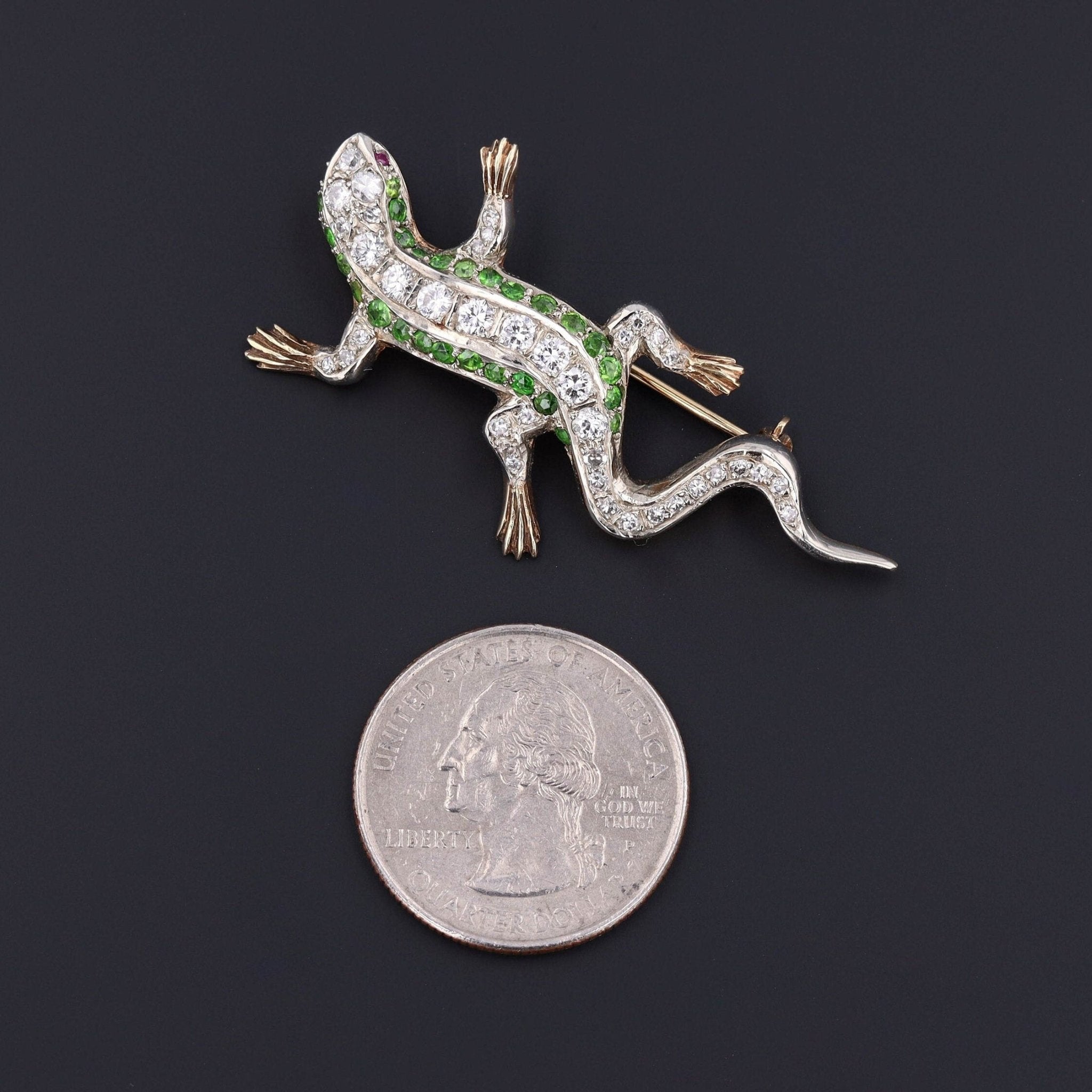 An exquisite example of mid-20th century fine jewelry design, this elegant lizard brooch is crafted in warm 14k yellow gold and brought to life with dazzling gemstone accents. The body shimmers with bright, verdant demantoid garnets—renowned for their vivid green hue and brilliance - with large sparkling diamonds. Two tiny ruby eyes provide a final touch of fiery charm, adding depth and personality to the lifelike form.