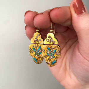 An elegant pair of antique earrings dating to the late Victorian era (circa 1870-1890), featuring delicately rendered butterfly motifs set with vibrant turquoise and luminous pearls, all crafted in solid 14k gold. Butterflies were cherished symbols in Victorian jewelry, representing transformation, renewal, and the soul, and were often chosen for their lightness, beauty, and poetic meaning.