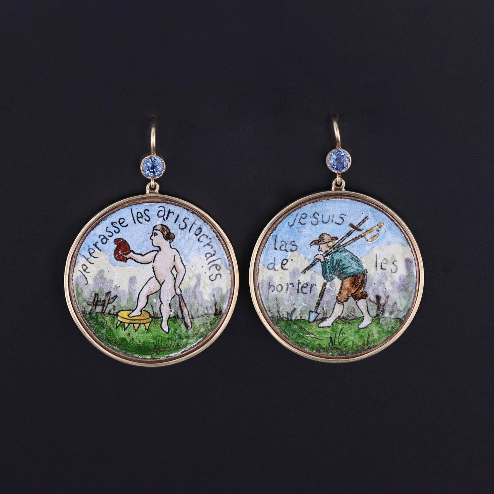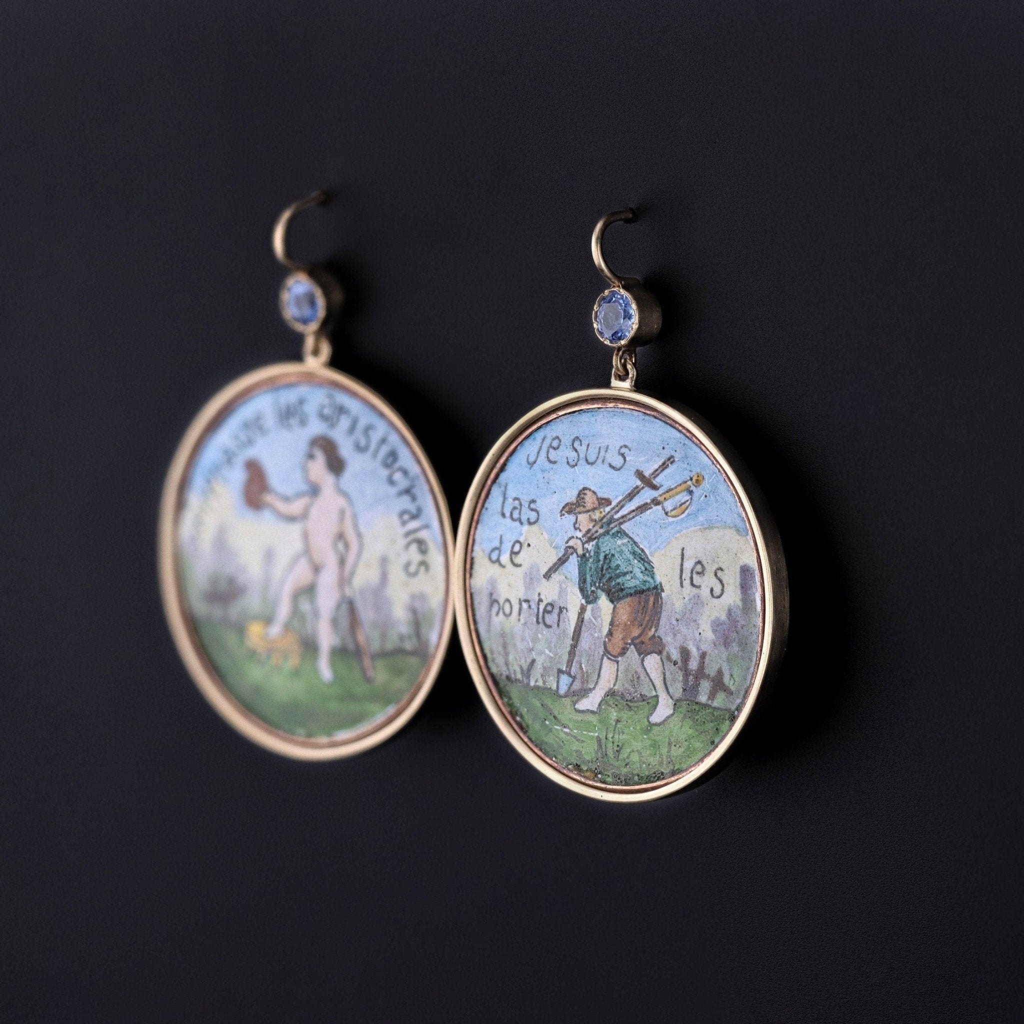 The earrings are hand painted enamel. One bears a person stepping on a crown with a bat and squeezing a heart in his hand. It reads "Jeterasse les aristocracies" in French which translates to: "Throw Out the Aristocrats." The other shows an old man in a field carrying two swords on his back. It reads "Je suis las de les porter" in French which translates to: "Fed up with Carrying Them."
