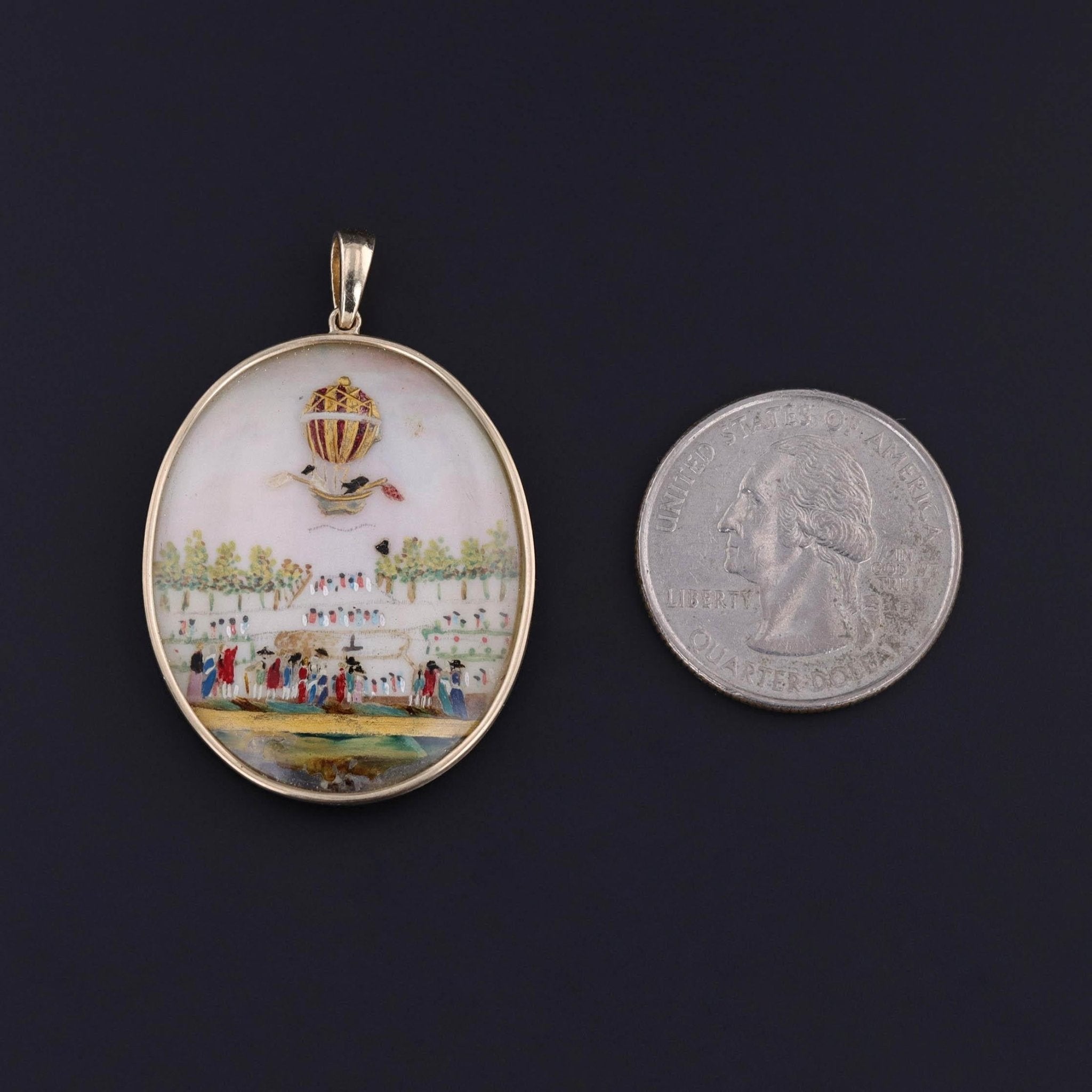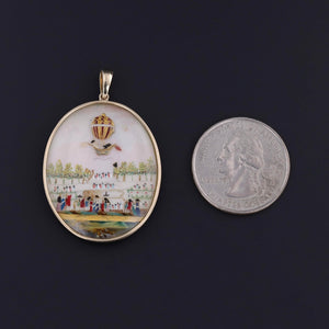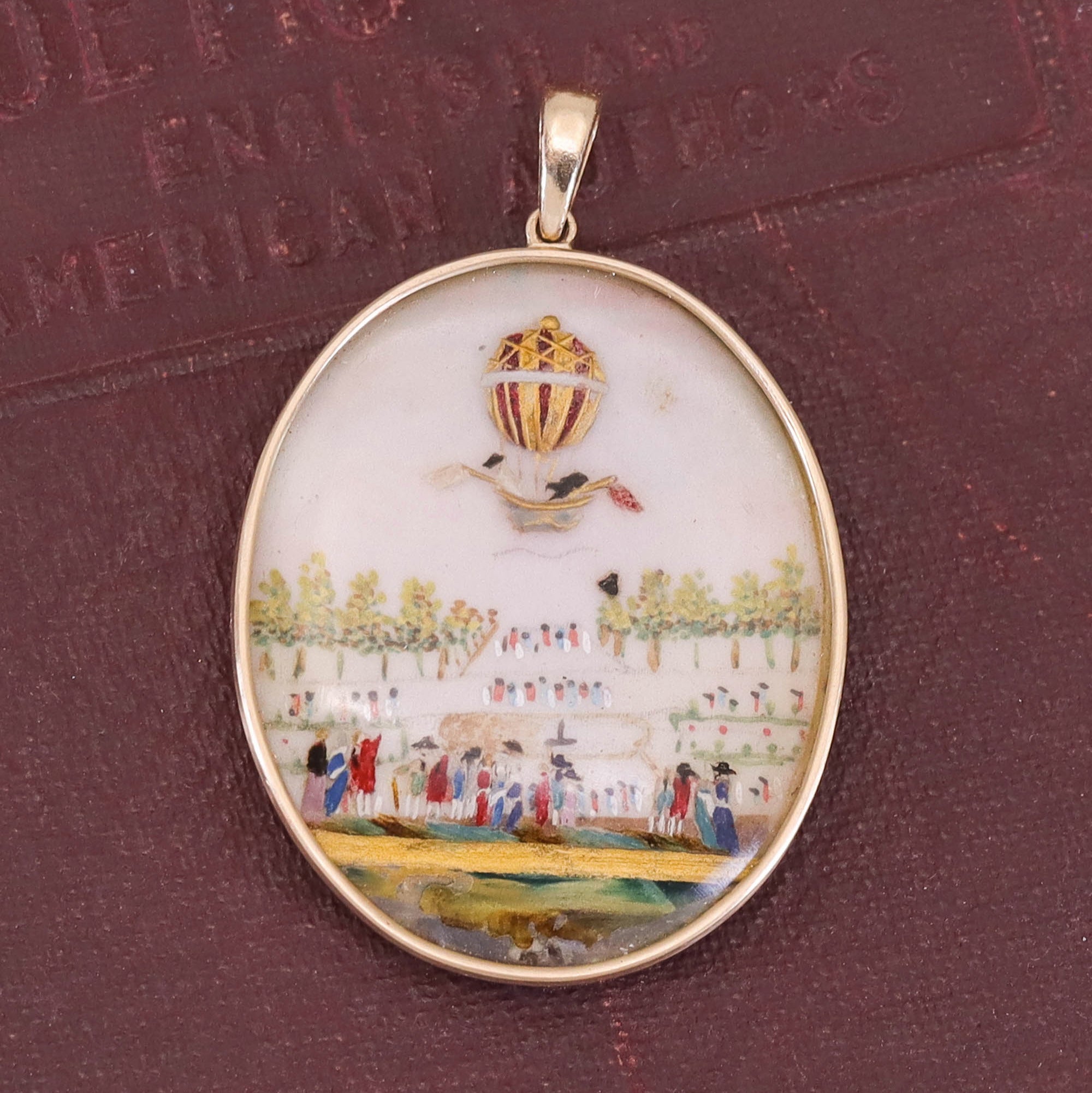 This remarkable pendant showcases a Georgian-era enamel miniature (circa 1783–1800), exquisitely hand-painted with a scene of spectators gathered to witness a hot air balloon ascent—a dazzling innovation of the time and a powerful symbol of Enlightenment-era curiosity and progress.