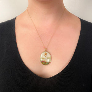 The pendant measures approximately 1.7 inches from the top of the bail to the bottom, 1.1 inches wide, and weighs 8.25 grams. The enamel scene is exceptionally well-preserved, and the gold has been professionally verified as 14k through X-ray fluorescence (XRF) testing and jeweler’s acid.