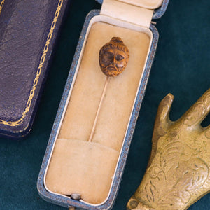 Mysterious and finely crafted, this antique stickpin (circa 1880) features a hand-carved face rendered in golden-brown tiger’s eye—a stone revered for its captivating chatoyancy and protective symbolism.