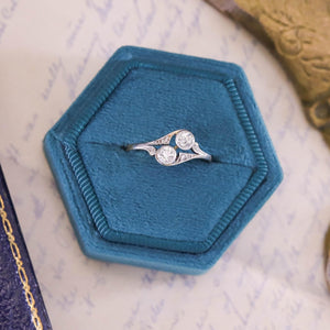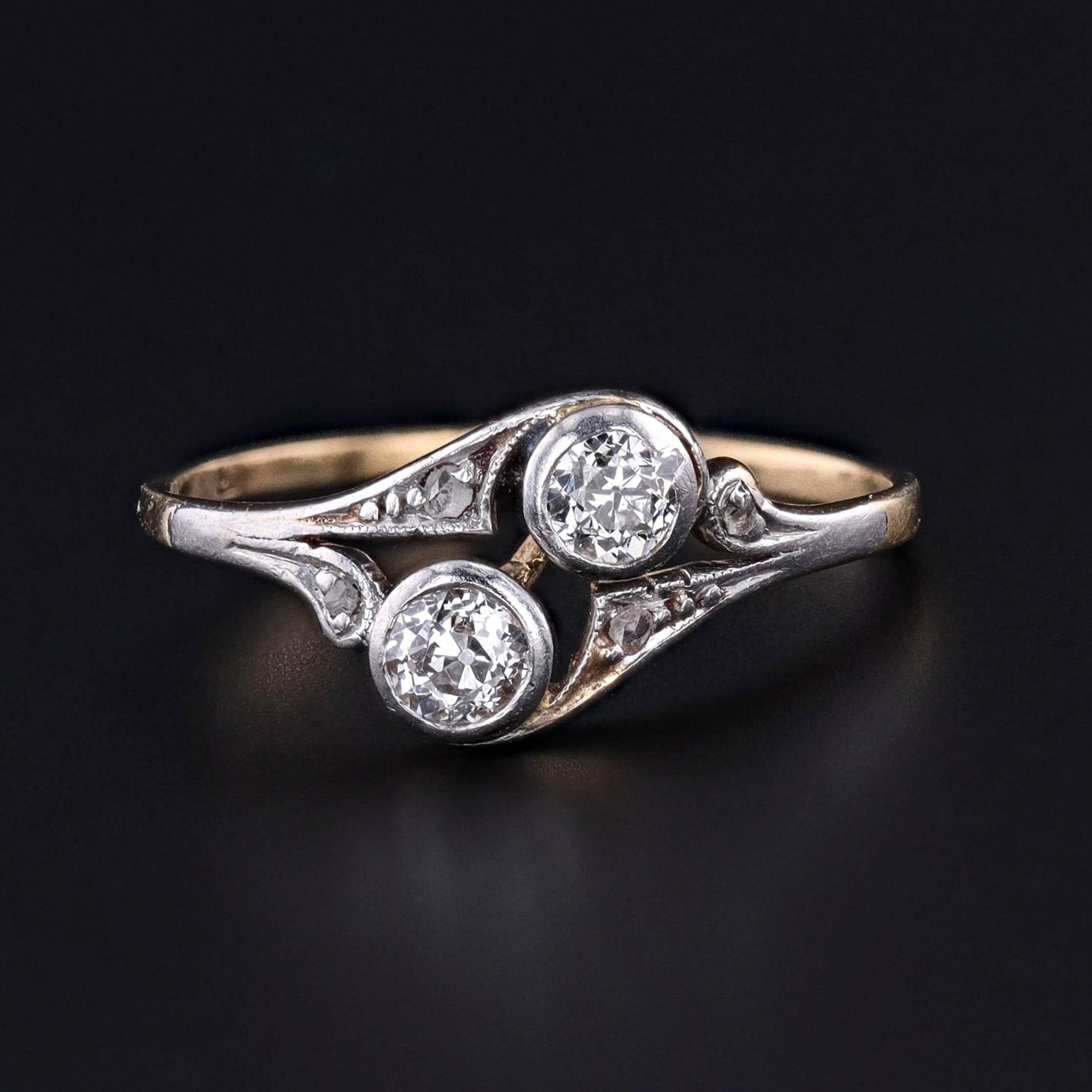 This antique ring (circa 1900–1910) is set with two sparkling old European cut diamonds weighing approximately 0.32 carats in total. The stones are mounted in platinum-topped 14k gold, a favored construction of the Edwardian era that enhanced brilliance while preserving the warmth of gold.