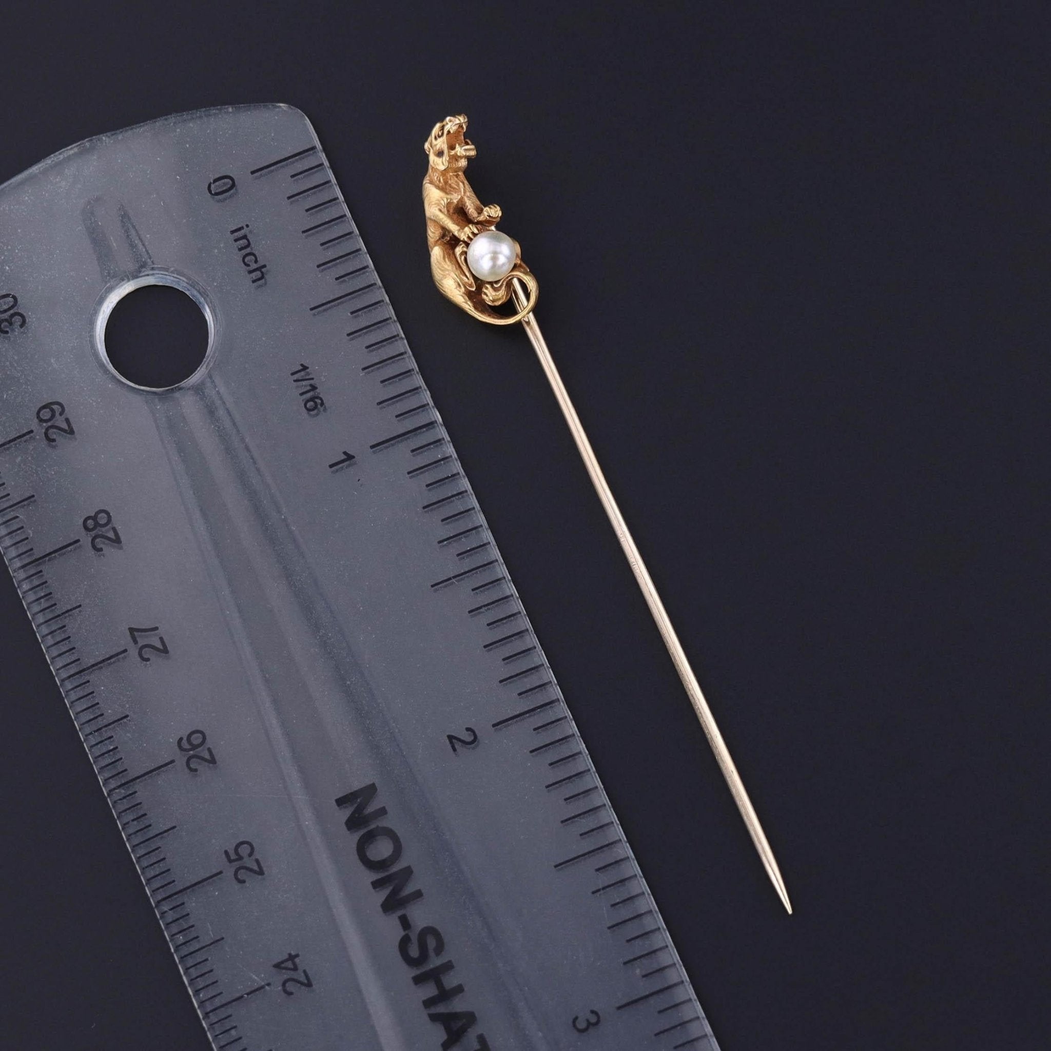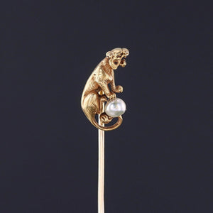 This striking antique stickpin (circa 1900) features a finely modeled roaring tiger crafted in solid 14k gold, perched above a lustrous natural pearl. The tiger's expressive form—open jaws, sharp teeth, and powerful stance—captures the fierce energy and symbolism of strength and protection often attributed to big cats in turn-of-the-century jewelry.