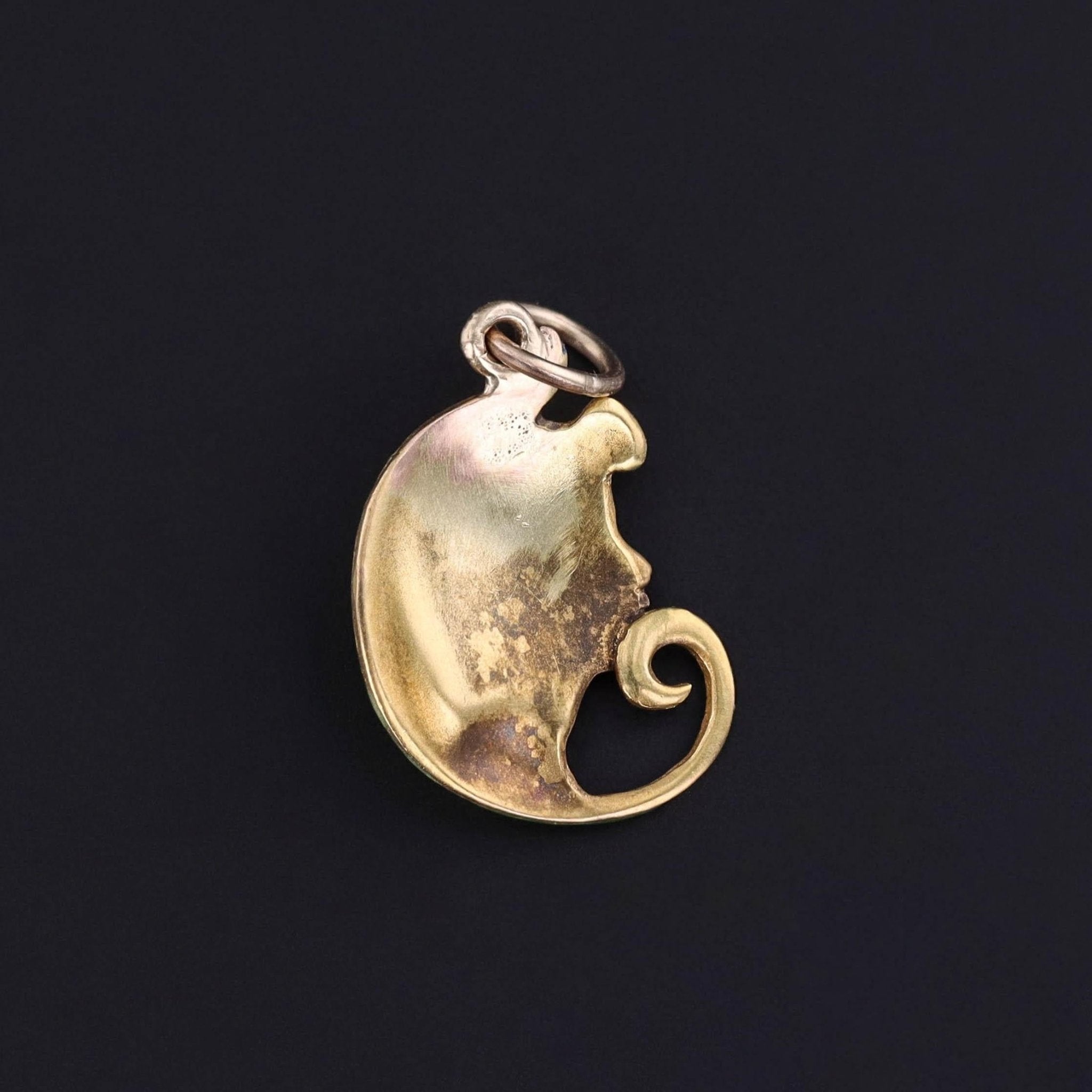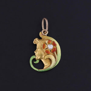 An enchanting jewel from the Art Nouveau era (circa 1900), this antique charm depicts a finely modeled woman in 14k gold, crowned with a delicate enameled flower and accented by a lustrous pearl. The piece embodies the movement’s devotion to feminine beauty, natural forms, and graceful lines—hallmarks of the most collectible jewels of the period.