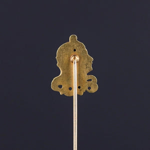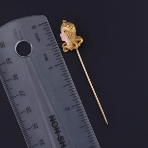 A poetic tribute to femininity and artistry, this Art Nouveau stickpin (circa 1910) features a beautifully enameled woman’s face, framed by flowing hair and accented with inset gemstones, all rendered in solid 18 karat gold. Her delicate features and the soft pastel tones of the enamel embody the elegance and organic movement central to the Art Nouveau aesthetic.