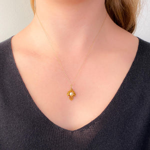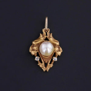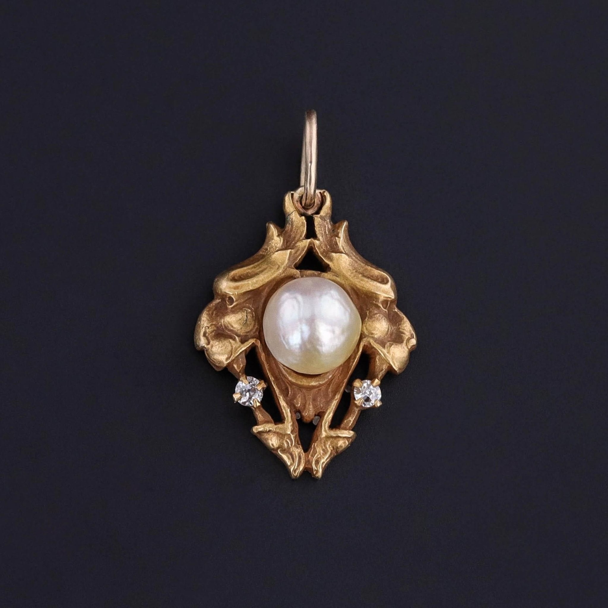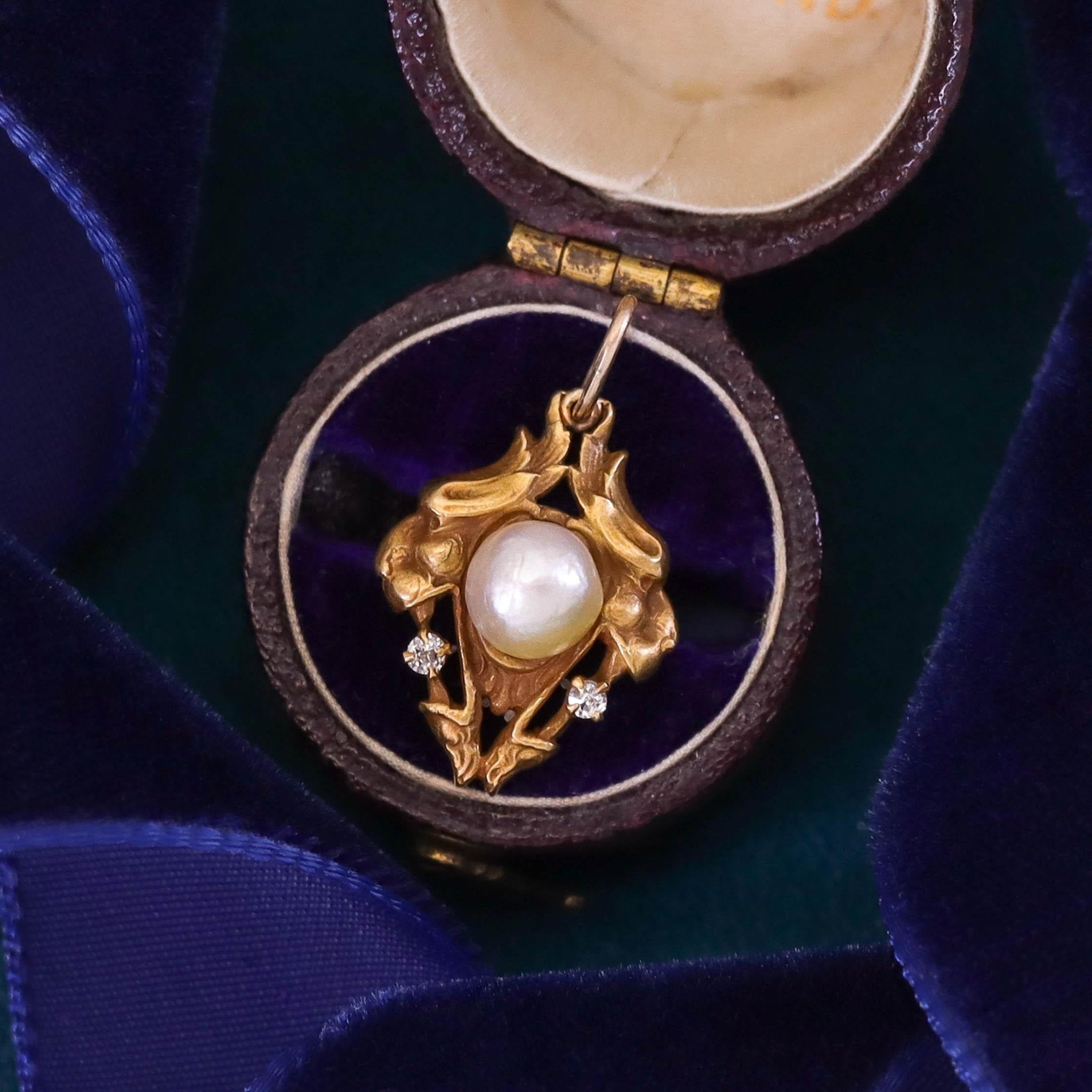Exquisite in both detail and symbolism, this Art Nouveau charm (circa 1900) features a luminous white pearl flanked on either side by finely rendered lion heads, each holding a single-cut diamond in their jaws. The pairing of motifs reflects the period’s fascination with nature and strength — the pearl symbolizing purity and wisdom, while the lions embody courage and guardianship.
