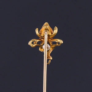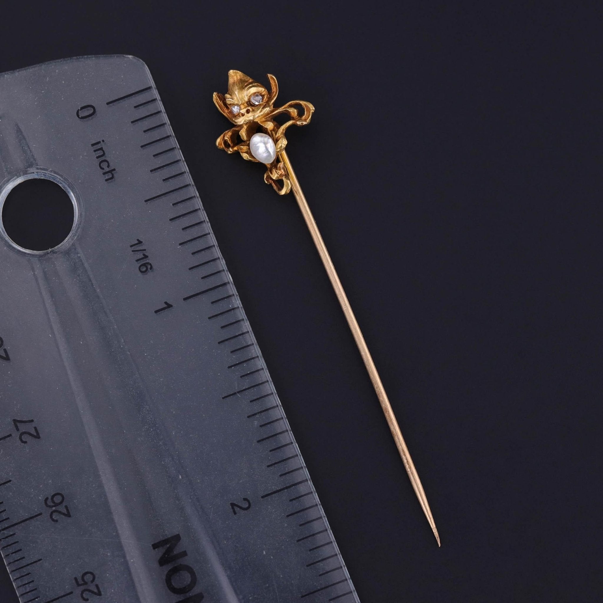 The pin head measures approximately 0.6 inches by 0.5 inches wide, with the full stickpin length extending to 2.45 inches. It weighs 2.75 grams and remains in excellent antique condition, with crisp detail preserved.