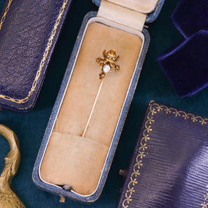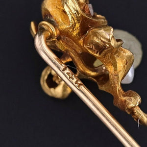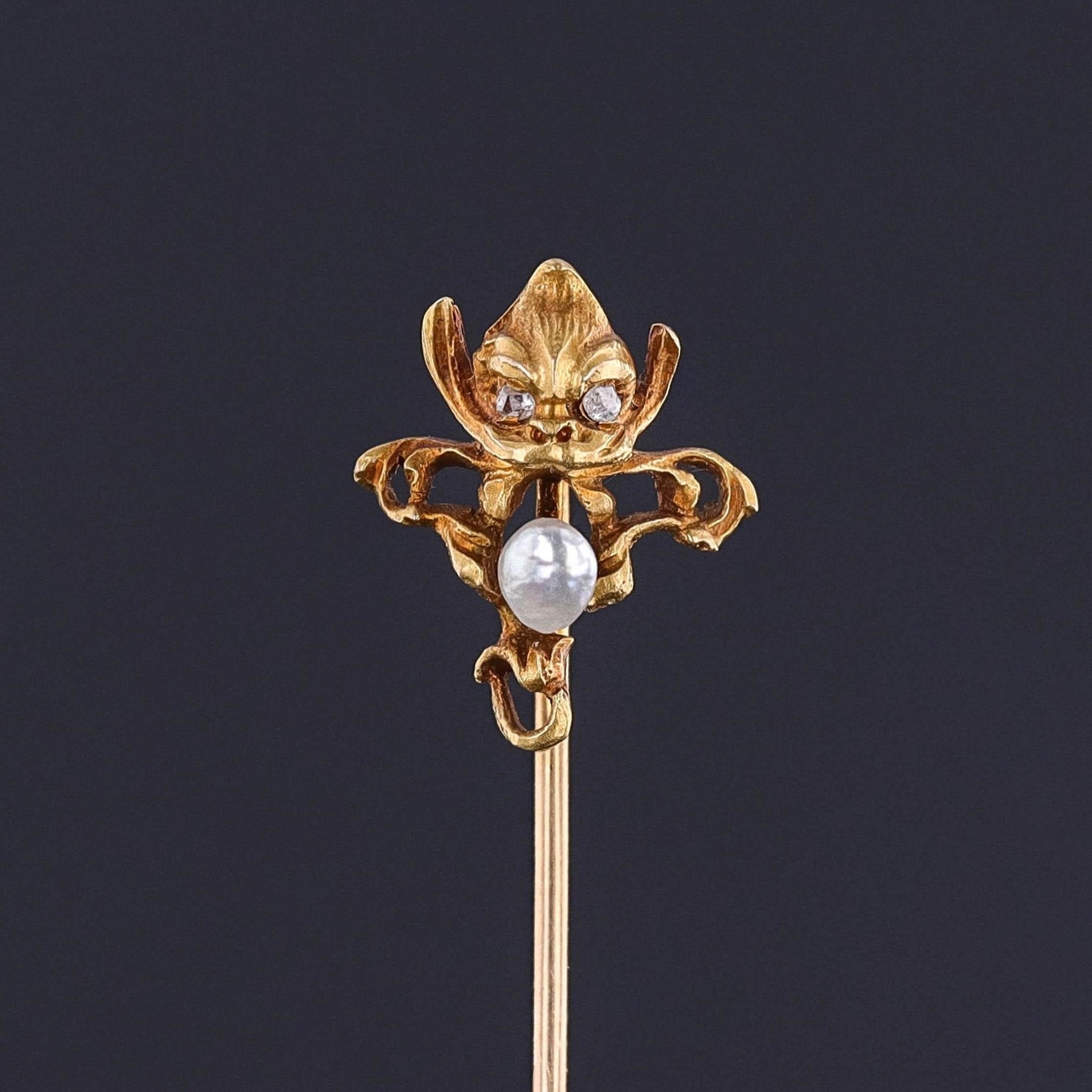 Dramatic and rare, this Art Nouveau stickpin (circa 1890) depicts a finely detailed gargoyle rendered in 14k gold, its fierce expression brought to life with two sparkling diamond eyes and a luminous pearl accent. Gargoyle motifs, while unusual in jewelry, symbolized protection and guardianship, making this piece both powerful and collectible.