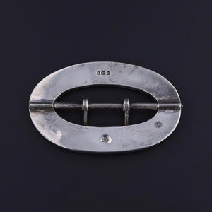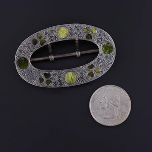 A beautiful artifact of Victorian-era craftsmanship, this antique belt buckle (dated 1882) features intricately detailed Connemara marble shamrocks set into a hand-etched sterling silver frame. The rich green hues of the Irish marble contrast elegantly against the cool gleam of the silver, symbolizing luck, heritage, and artistry.