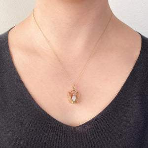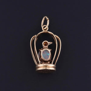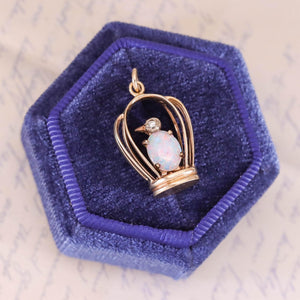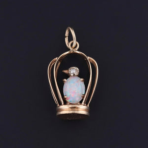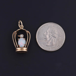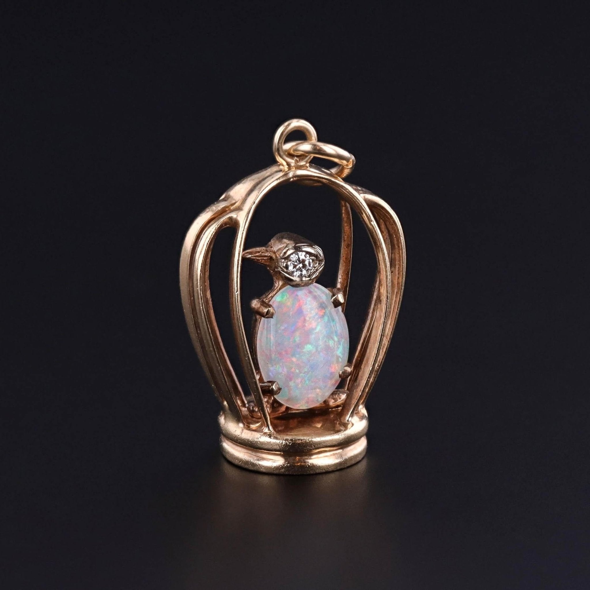 This enchanting vintage pendant (circa 1940-1960) captures a bird in a cage, rendered in 14k gold and adorned with a fiery white opal and sparkling diamond accents. The opal is particularly lively, displaying a kaleidoscope of shifting colors that enliven the whimsical design.