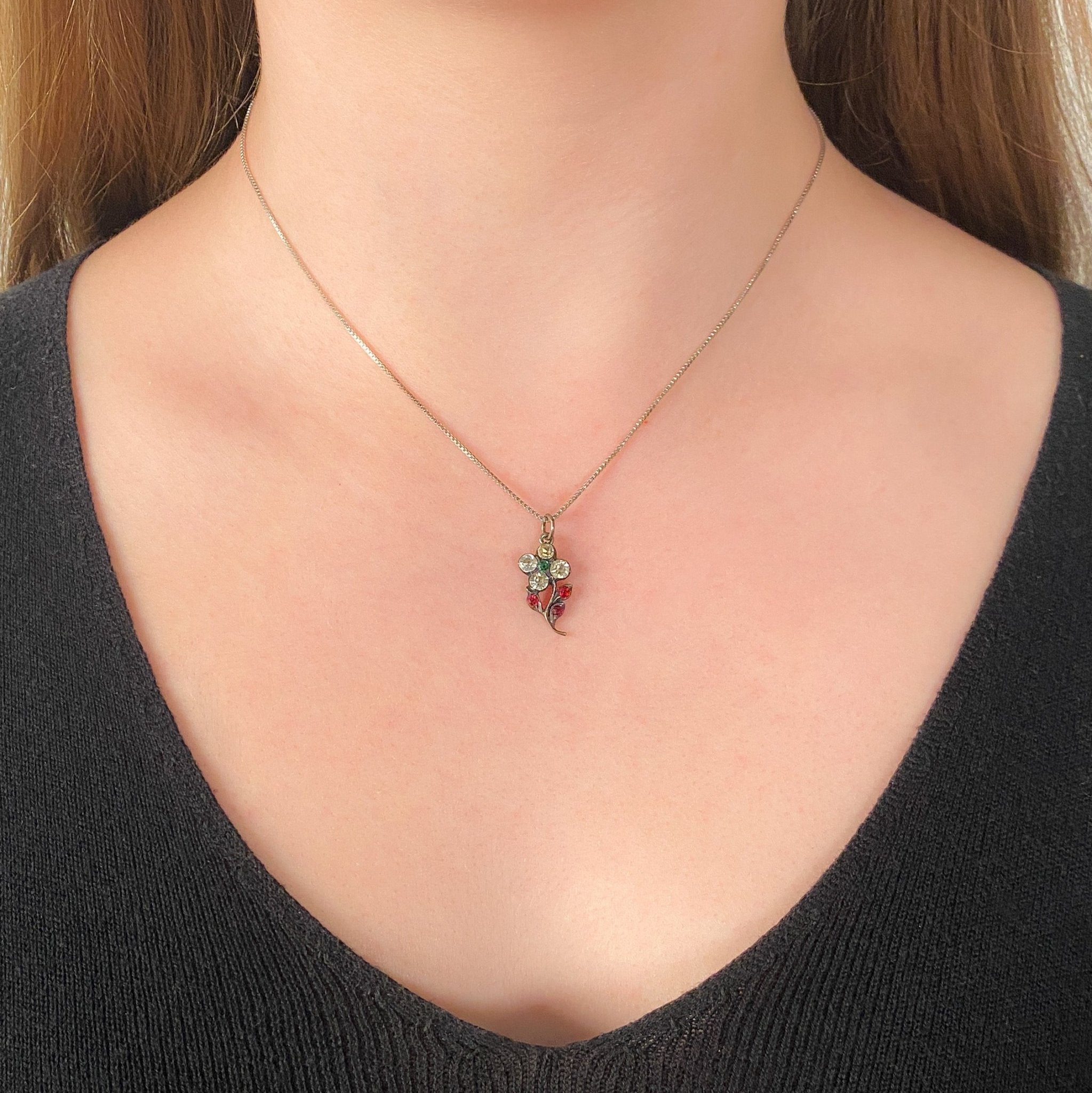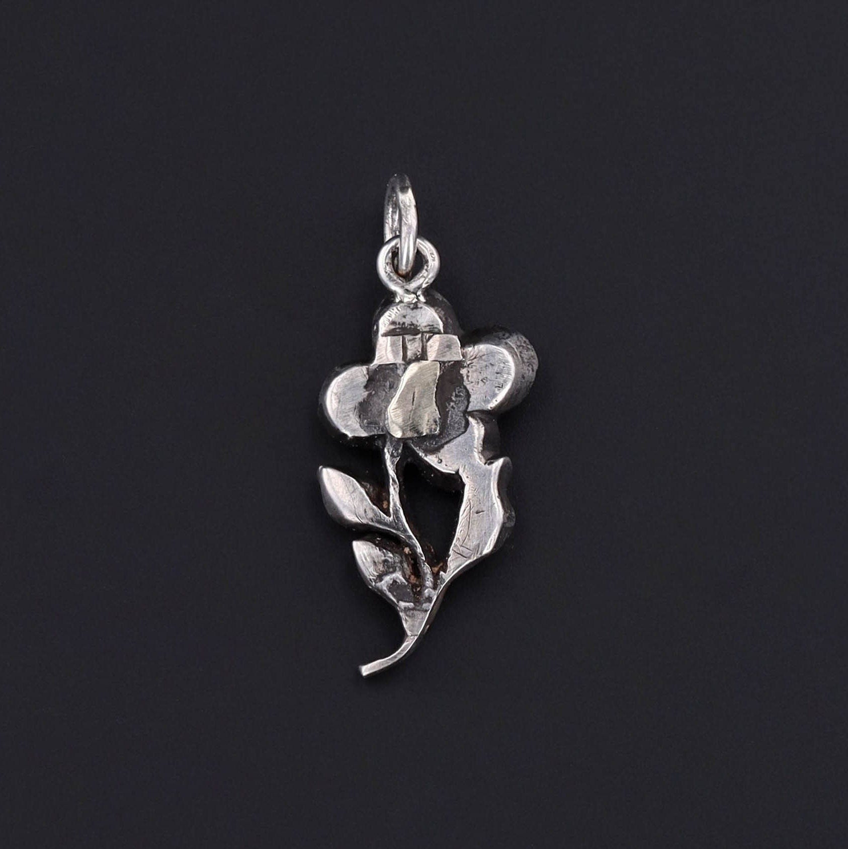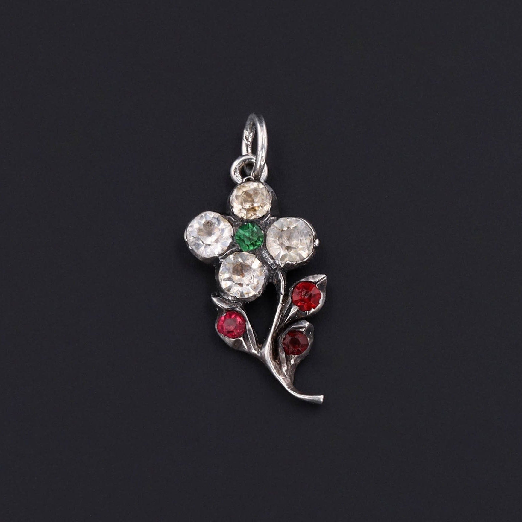 This charming pendant was converted from an antique stickpin (circa 1870) by removing the pin and adding a silver jump ring bail. The design features a delicate flower rendered in vibrant colored paste (glass) and set in silver, reflecting the Victorian fascination with romantic, nature-inspired motifs.