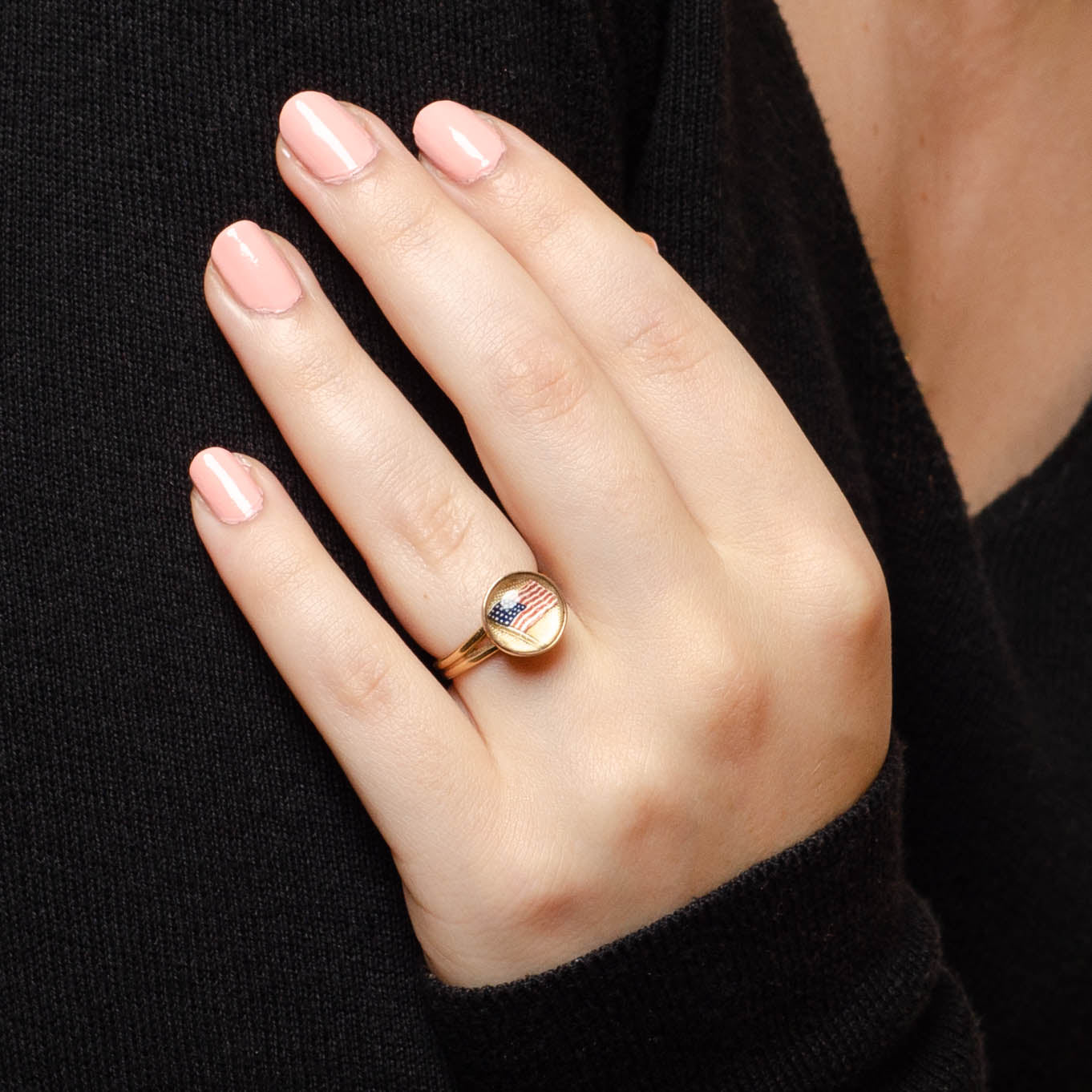 The face of the ring features a hand painted American flag of what appears to be paper on a cloth backdrop set under domed glass. Our jeweler transformed the 14k gold piece into a ring by welding it onto a split 14k gold band.